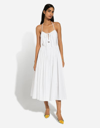 The Flowering Collection has us dreaming of faraway destinations, the most exclusive ones in the world, inviting us through the colors and the yellow rose print to take refuge in warm and unique places. Light White, lemon yellow, polka-dot accents and the various shades of leaf green for vibrant and ultra-feminine pieces where the keyword is tailoring. Every look invites us to savor and dream every moment of our free time, to discover beauty and enhance our femininity. Midi cotton dress with circle skirt: • White • Deep neckline with drawstring lacing • Sleeveless with halterneck tie • Unlined • Rear zipper and hook-and-eye fastening • The piece measures 85 cm from the waist down on a size IT 40 • The model is 175 cm tall and wears a size IT 40 • Made in Italy External composition: 100% Cotton Internal composition: 100% Cotton