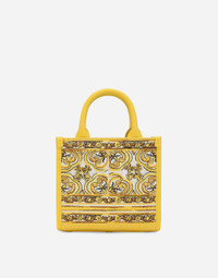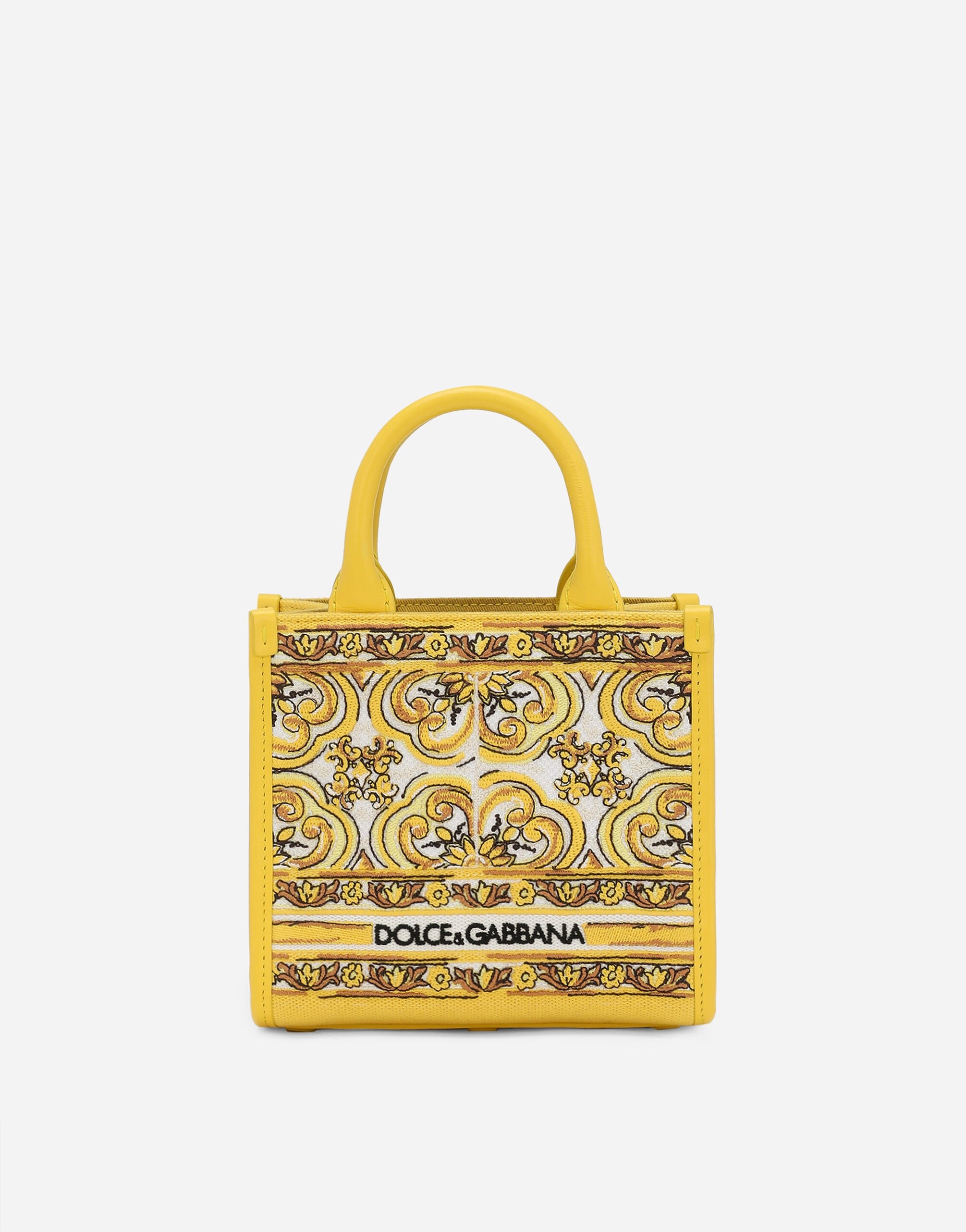 The new collection is inspired by the ancient ceramics of Caltagirone, where tones of white and yellow merge in a tribute to Sicilian craftsmanship and majolica tiles, reinterpreted in a contemporary way. Mini DG Daily shopper with majolica embroidery: • Yellow and white • Embroidered Dolce&Gabbana logo • Calfskin handles • Adjustable and detachable calfskin strap • Fabric lining with zipped pocket, flat pocket and a card slot compartment • Item comes with a branded dust bag • Measurements: H16.5 x W17.5 x D8 cm • Made in Italy External composition: 70% Cotton 30% Calfskin Internal composition: 50% Cotton 40% Calfskin 10% Acrylic
