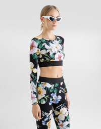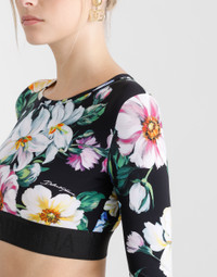 The Spring/Summer 2025 Warm Weather Collection is a vibrant ode to the beauty of the floral world, celebrating the elegance and vitality that lie at the heart of the brand’s DNA. Delicate, colorful bouquets dance across light dresses, skirts, trousers, and beachwear, infusing each piece with a sense of romance and freshness. Coordinated accessories, from scarves to headbands, add charm. An explosion of color and blooms, this collection captures the brand’s unmistakable spirit. Floral-print run-resistant jersey crop top with branded elastic: • Multi-colored • Round neck • Long sleeves • Elasticated waistband with Dolce&Gabbana logo • The model is 175 cm tall and wears a size IT 40 • Made in Italy The difference in the print placement that you may find on this product is a feature of Dolce&Gabbana’s “Handmade” pieces. A detail that makes every garment or accessory unique and exclusive. External composition: 73% Polyamide 27% Spandex