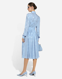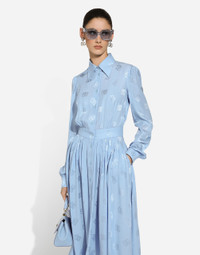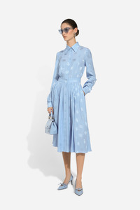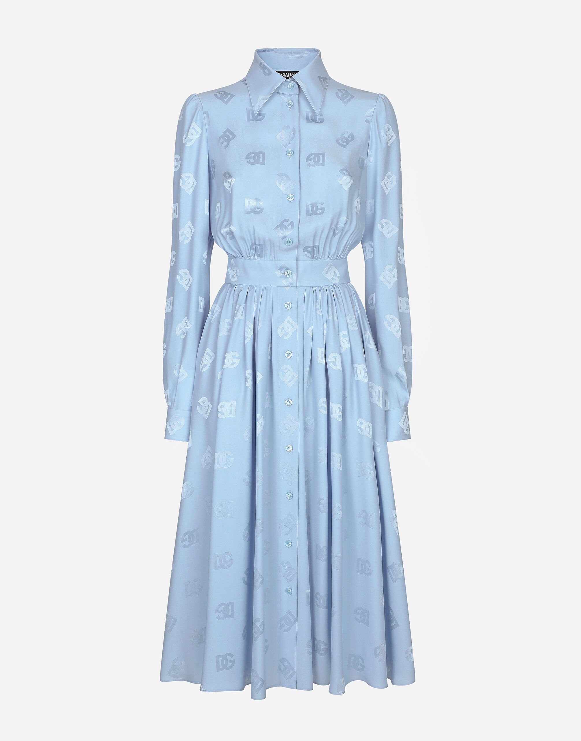In the FW 24/25 DNA Collection, the rules of classic tailoring have been reworked with an innovative feel. New raschel weave techniques feature on micro-jackets and coats, and original textures are woven on trench coats, skirts, jacquard suits and shirts. The color palette made up of Nero Sicilia black, Milky White and Ocean Blue is also original. The iconic bags in fine nappa leather and “Pyton FC Machine” finish off the looks. Silk satin jacquard shirt dress with all-over DG logo: • Light blue • Shirt collar • Long sleeves • Unlined • Covered button fastenings on the front • The piece measures 118 cm from the back of the neck on a size IT 40 • The model is 175 cm tall and wears a size IT 40 • Made in Italy External composition: 100% Silk