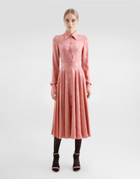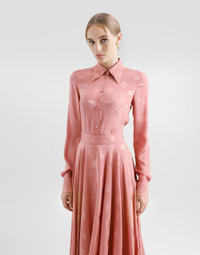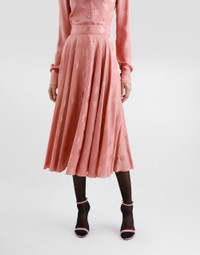 The Women’s DNA Collection is introducing a new side to femininity, which comes in shades of rose quartz, poised between sheerness and opacity, lightness and structure, formality and sensuality. Geometric Dolce Jackets, jacquard pajamas and floral brocade dresses intertwine with ultra-romantic designs. The DG print becomes an iconic statement, while Cordonetto lace and hints of Sicily Black embody the essence of a determined yet romantic femininity. Silk jacquard calf-length circle skirt with DG logo: • Pink • High-waisted • Unlined • Rear zipper and hook-and-eye fastening • The piece measures 80 cm from the waist down on a size IT 40 • The model is 175 cm tall and wears a size IT 40 • Made in Italy External composition: 100% Silk