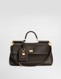 In the Fall/Winter 2025 Fashion Show Collection, shearling jackets, in fur-free versions, reveal slip dresses and create contrast' plays while denim welcomes fabric or Leo print inserts. Sweatshirts are the result of long experimentation with volumes. Evening looks become precious thanks to dresses with special embroideries and luminous touches of sequins and crystals. Sheepskin inserts also unite hats, shoes, and bags, including those with pockets. The My Sicily handbag is a symbol of elegance and functionality, made with fine workmanship in plonge Calfskin and vintage brass details. My Sicily handbag in plonge lux calfskin: • Brown • Leather handles, removable and adjustable leather shoulder strap • Tuck-in closure • Vintage brass plating • External customization with monogalvanic plate and stamp with film • Internal customization with stamp with film • Interior with zip pocket and flat pocket • Item equipped with logo bag and a pre-assembled box • Measurements: H20 x W30 x D13 cm • Can hold keys, card holder and phone • Made in Italy External Composition: 95% Calfskin, 5% PVC Internal Composition: 70% Cotton, 25% Calfskin, 5% Acrylic This product is made with leather from tanneries certified according to environmental standards.
