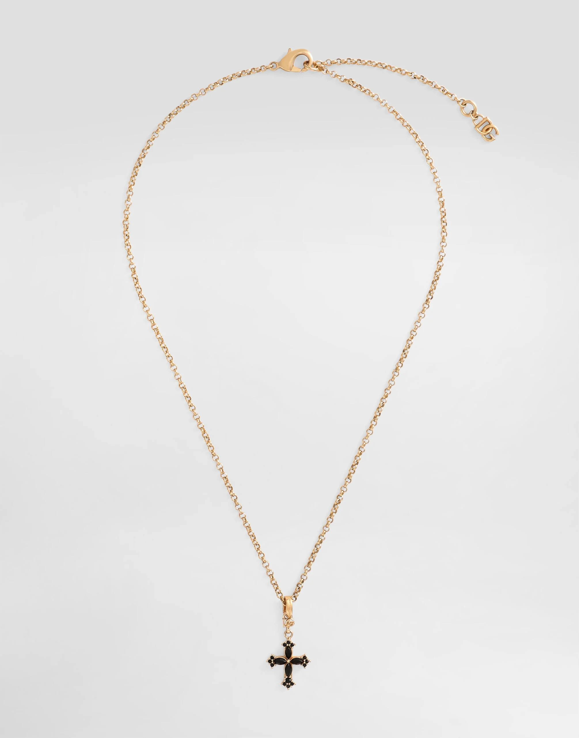 The SS26 Women's Fashion Show Collection is the result of a play of harmonious contrasts: masculine and feminine, day and evening, tailored and casual. Pyjamas take centre stage, paired with lingerie and formal garments. The play of layers and the mix of different influences contribute to expressing the relaxed attitude and unique, original style at the heart of the collection. It brightens every look with a sophisticated and symbolic touch: this gold-toned necklace, featuring a cross and sparkling strass, blends style and meaning, transforming any outfit into a statement of elegance and personality. Necklace with cross and rhinestones: • Gold • Length: 50 cm • Made in Italy External Composition: 90% Brass, 10% Glass