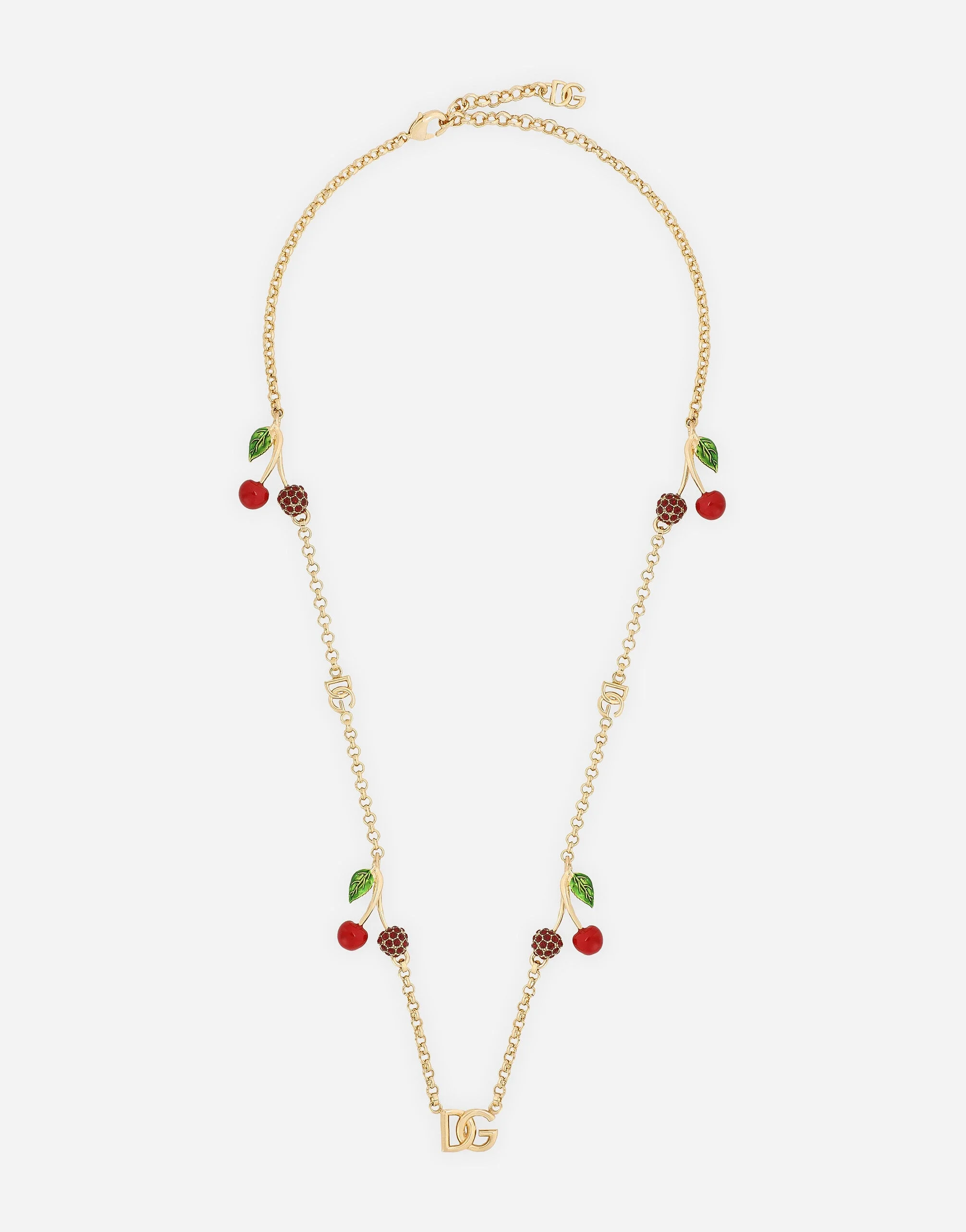 The absolute star of the new Black Sicily collection is black, the color of immortal elegance that encapsulates the most diverse facets of Dolce&Gabbana. They preserve the signature identity of the brand’s DNA, which is reworked in the light of the word synthesis. The new black is not only rebellion, but also elegance, austerity and rigor, timeless in its absolute strength, it makes all looks even more attractive, seductive and sophisticated, Sicily black thus becomes the symbol of absolute beauty. Necklace with DG logo and cherry charms: • Gold • Clasp fastening • Nickel-free and hypoallergenic materials • Engraved logo • Made in Italy Composition: 80% Brass 10% Glass 10% Enamel
