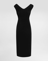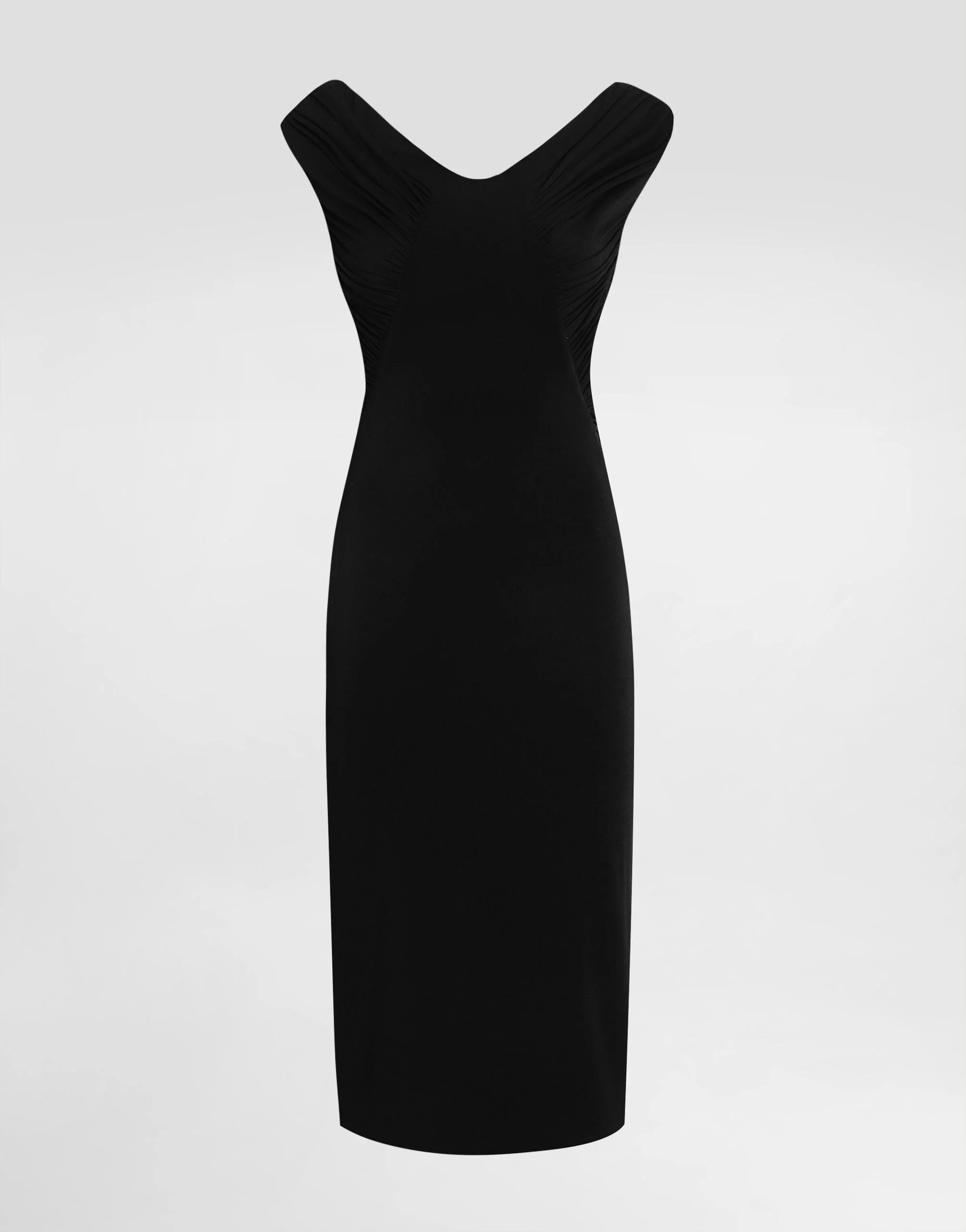 This bodycon dress is perfect for a special evening or an elegant event. With its sophisticated design and fine details, it is a garment that does not go unnoticed. Fitted dress in organza crepe: • Black • Wide neckline front and back • Slightly dropped shoulder • Cut to the sides with drape • Slit in the center front • Invisible zip opening • Waist length 75 cm on size 40 IT • The model is 175 cm tall and wears size 40 IT • Made in Italy External Composition: 95% Viscose, 5% Elastane