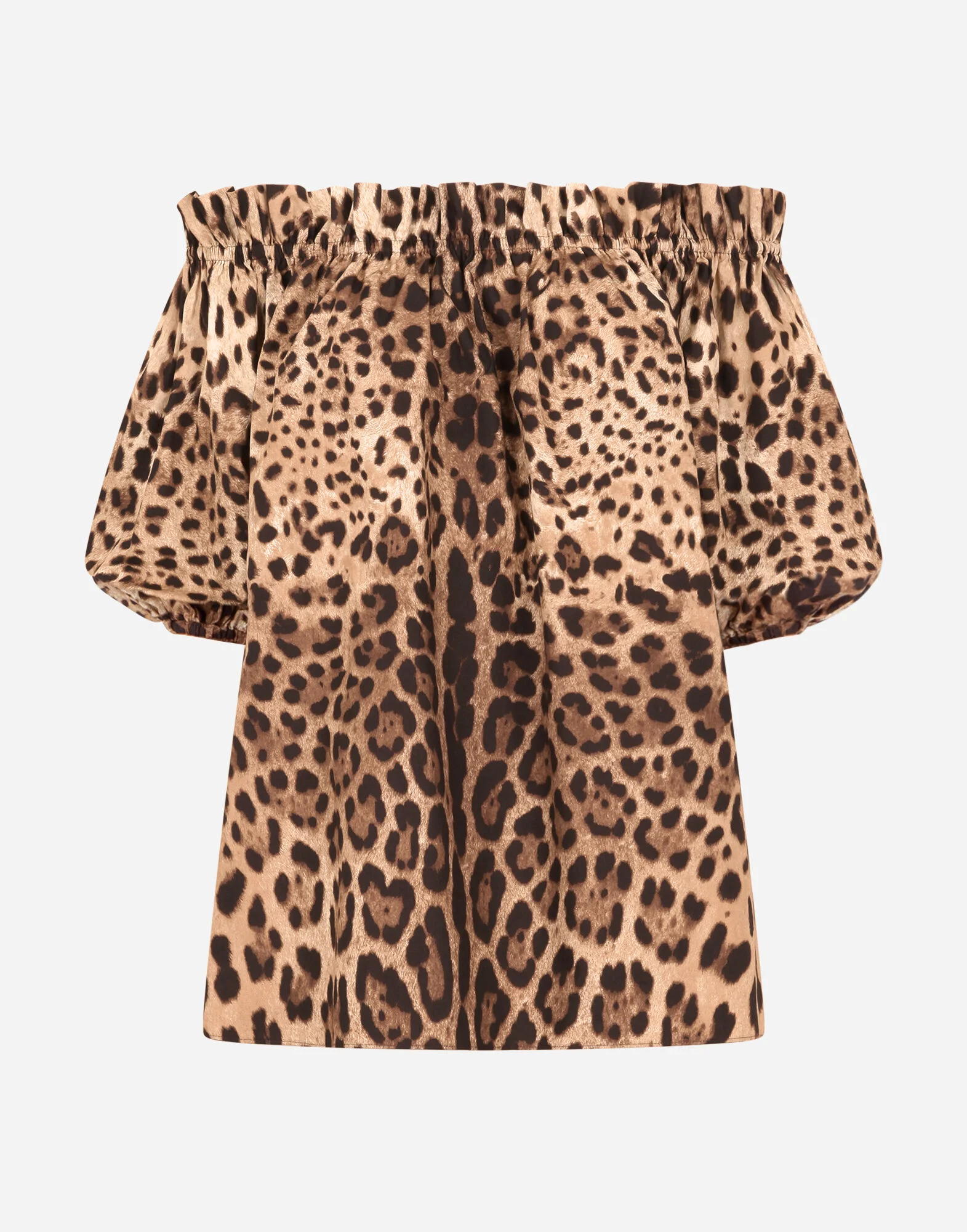 Dolce&Gabbana’s very identity can be seen in the iconic animal print of this stretch cotton poplin top. • Off-the-shoulder neckline with ruches • Short puff sleeves • Unlined • The piece measures 65 cm from the rear collar seam on a size IT 40 • The model is 175 cm tall and wears a size IT 40 • Made in Italy External composition: 100% Cotton