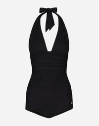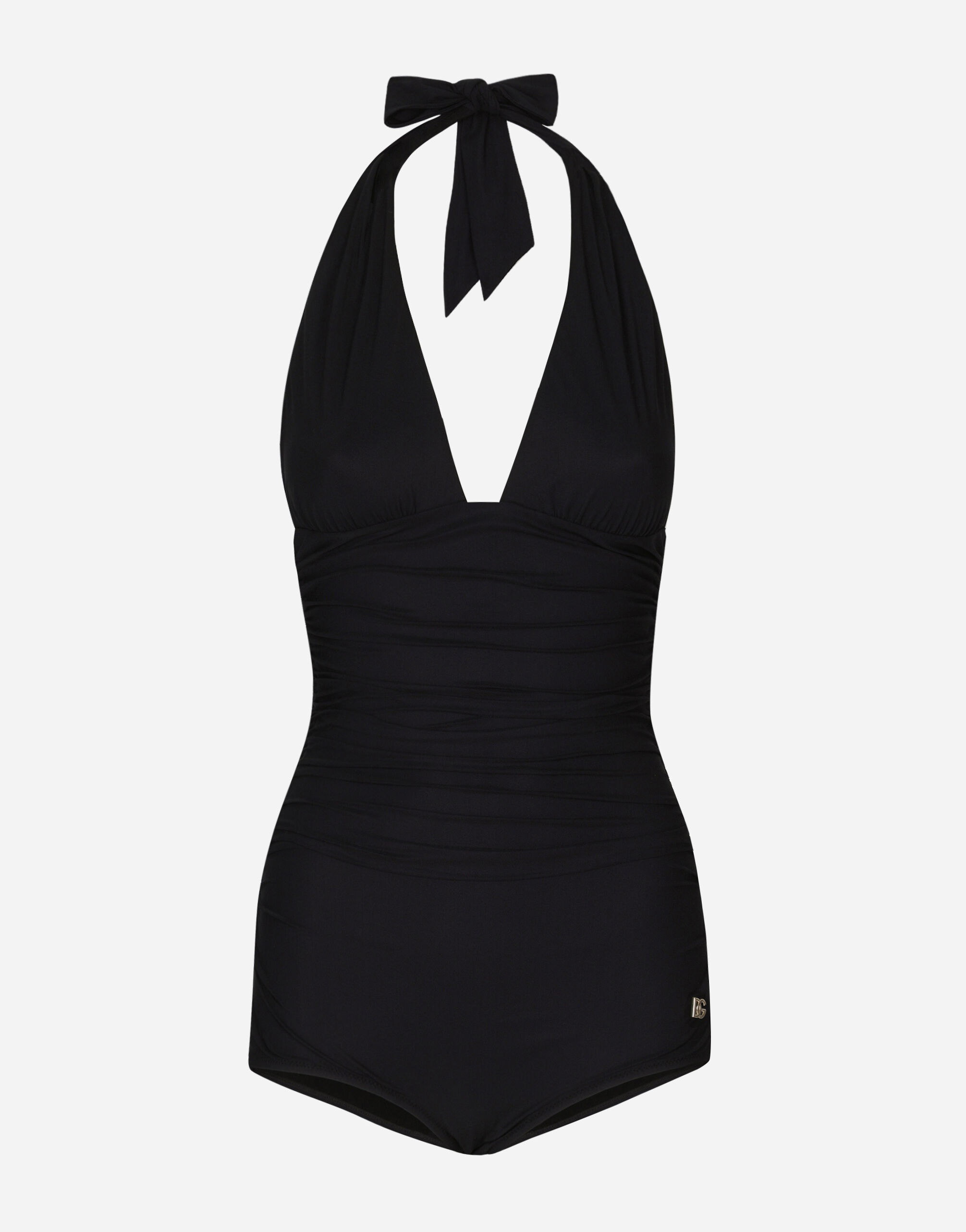 This refined one-piece swimsuit with draping on the sides comes in fine spandex and will give you an extraordinarily sophisticated look. The tie fastening behind the neck will guarantee the perfect fit. • Plunging V-neck on the front and a straight back • Triangle cups • DG logo in nickel-free gold-plated metal on the front side • Matching PVC pouch • Made in Italy External composition: 75% Polyamide 25% Spandex