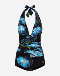 The spirit of the 1960s is taking over the new Flower Power collection. The focus is a head-to-toe floral look built around pairing and layering rose, anemone and floral bouquet maxi-prints. A cosmopolite poised between playful and sexy, this women interprets the austerity and elegance of the 1960s, harking back to boldly opulent imagery that here at Dolce&Gabbana is condensed and reinterpreted through silhouettes, ample proportions and airy shapes, bringing femininity and sensuality to the forefront. One-piece swimsuit with plunging neckline and bluebell print: • Multi-colored • Plunging V-neck on the front and a straight back • Triangle cups • Branded DG logo in nickel-free metal • Matching PVC pouch • Made in Italy The difference in the print placement that you may find on this product is a feature of Dolce&Gabbana’s “Handmade” pieces. A detail that makes every garment or accessory unique and exclusive. External composition: 72% Polyamide 28% Spandex Internal composition: 77% Polyamide 23% Spandex