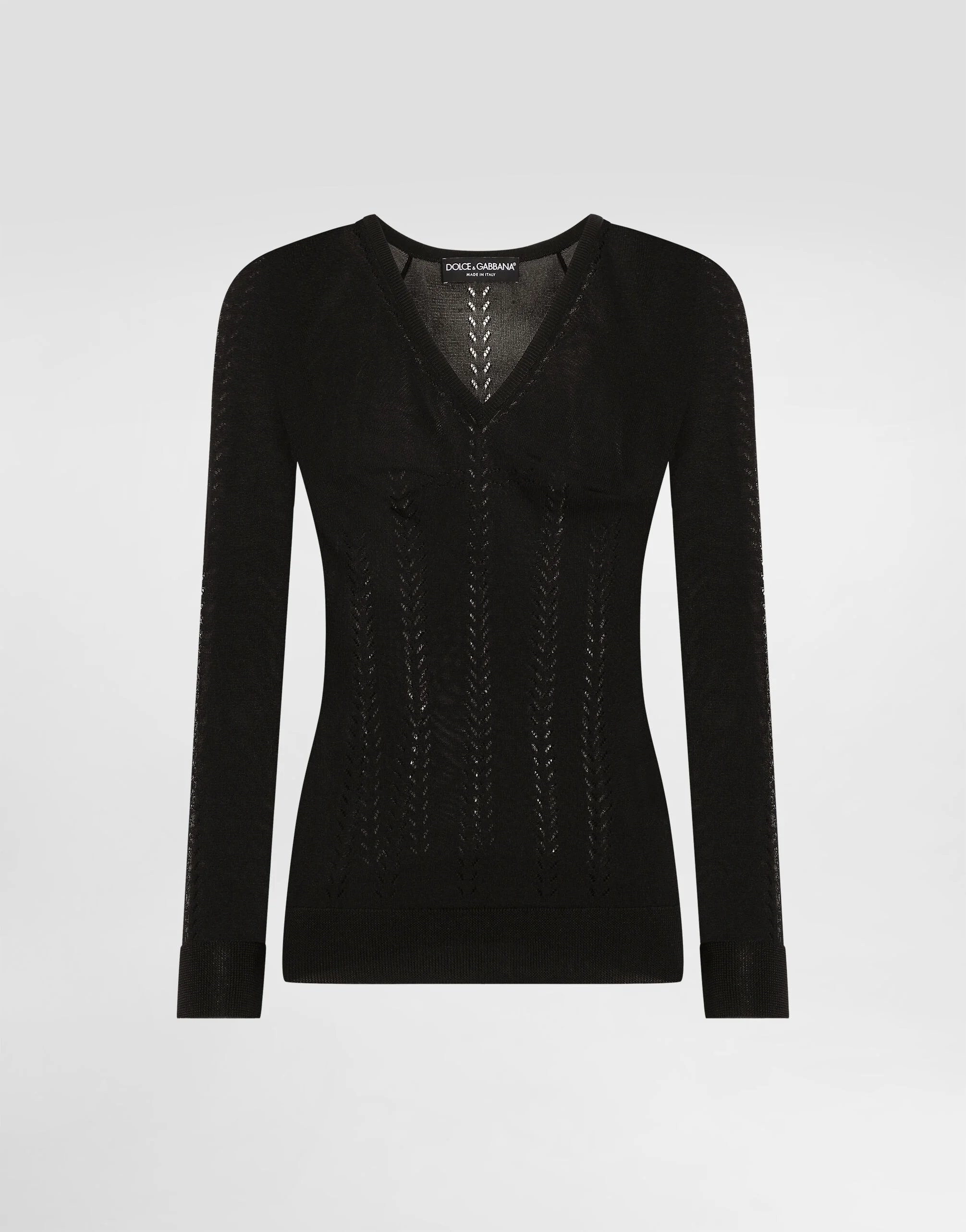 The Spring/Summer 2025 Women’s Collection is celebrating Italian beauty through bold and charismatic femininity. The 50s-inspired lingerie is the star, intermingling with fitted dresses, corsets and oversize trench coats. The iconic jackets have been updated with cropped cuts and modern inserts, while the floral prints add a romantic edge. The eveningwear shines with light fabrics and crystals, accompanied by look-defining accessories, from iconic bags to the cross earrings. Silk V-neck sweater stitch work: • Black • 14-gauge knit • V-neckline • Long sleeves • Ribbed trim • Raglan cuts • Slim fit • The piece measures 60 cm from the shoulder seam on a size IT 40 • The model is 175 cm tall and wears a size IT 40 • Made in Italy External composition: 97% Silk 2% Polyamide 1% Spandex