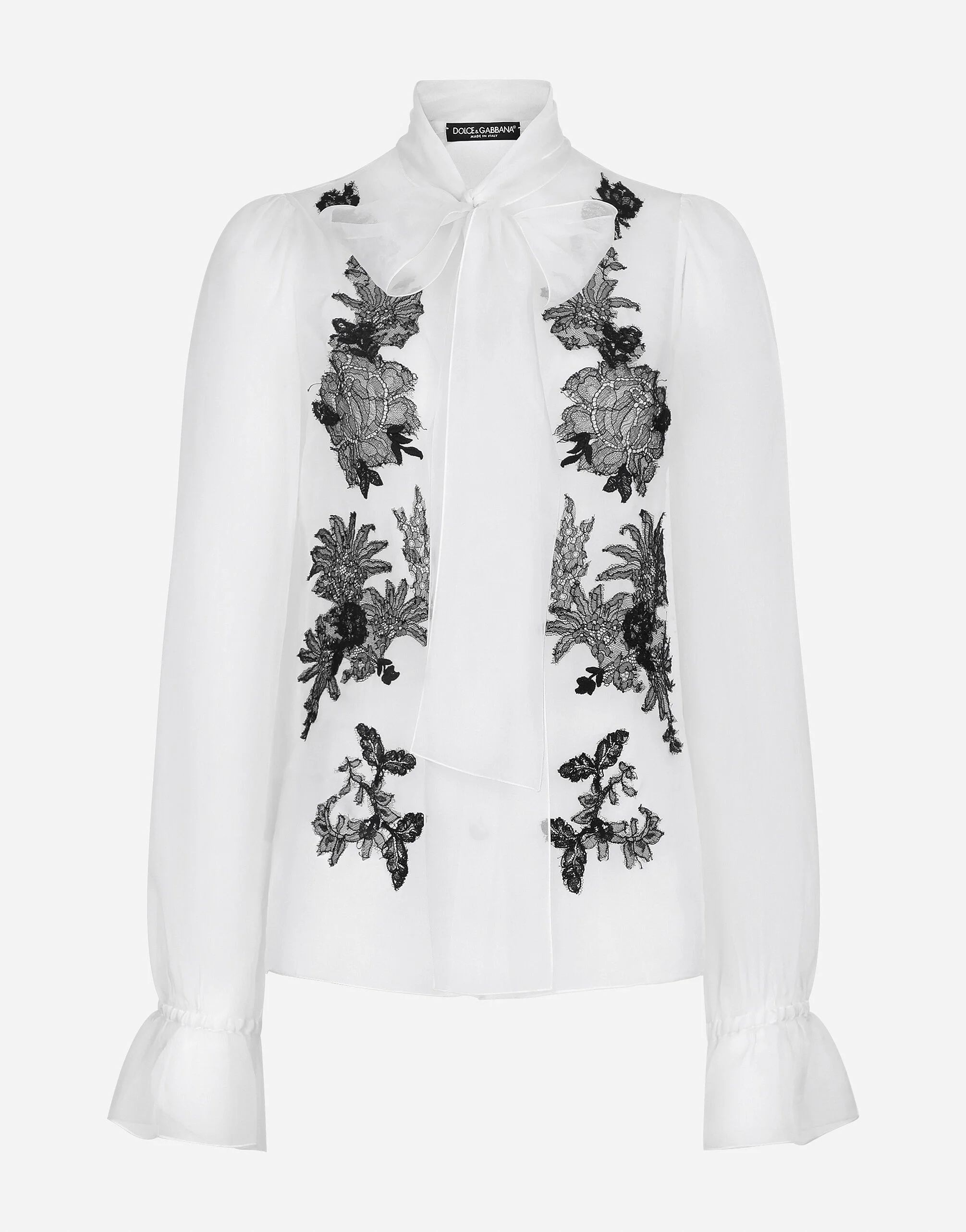 The DNA collection is distinguished by timeless shapes, bringing together three concepts: Sicilian flair, tailoring and sensuality. Nero Sicilia black and optical white predominate and pair with colors that catapult us onto the island of Sicily and make us dream. The designers channel the timeless wardrobe made up of creations that are instantly unmistakable in their simplicity, presenting us with sophisticated beauty loaded with meaning and symbolism that transcends fashion. Organza tuxedo shirt with lace inserts: • White • Pussy-bow neck • Long sleeves • Regular fit • Button fastenings with branded bottom edge • The piece measures 63 cm from the rear collar seam on a size IT 40 • The model is tall • Made in Italy External composition: 75% Silk 23% Cotton 2% Polyester