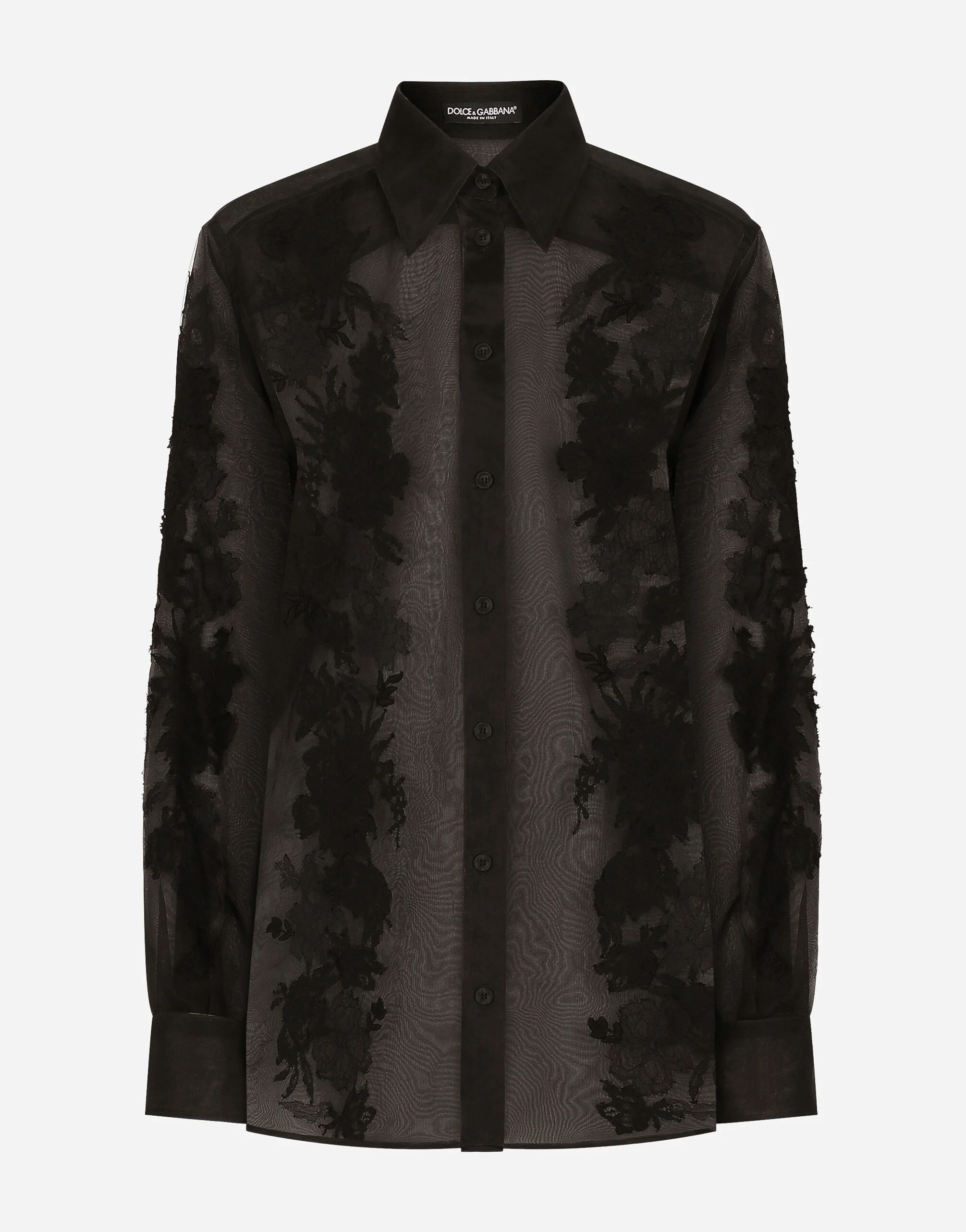 The DNA collection is distinguished by timeless shapes, bringing together three concepts: Sicilian flair, tailoring and sensuality. Nero Sicilia black and optical white predominate and pair with colors that catapult us onto the island of Sicily and make us dream. The designers channel the timeless wardrobe made up of creations that are instantly unmistakable in their simplicity, presenting us with sophisticated beauty loaded with meaning and symbolism that transcends fashion. Organza shirt with lace appliqués: • Black • Shirt collar • Long sleeves • Regular fit • Button fastenings with branded bottom edge • The piece measures 75 cm from the center back on a size IT 40 • The model is tall • Made in Italy External composition: 80% Silk 18% Cotton 2% Polyester
