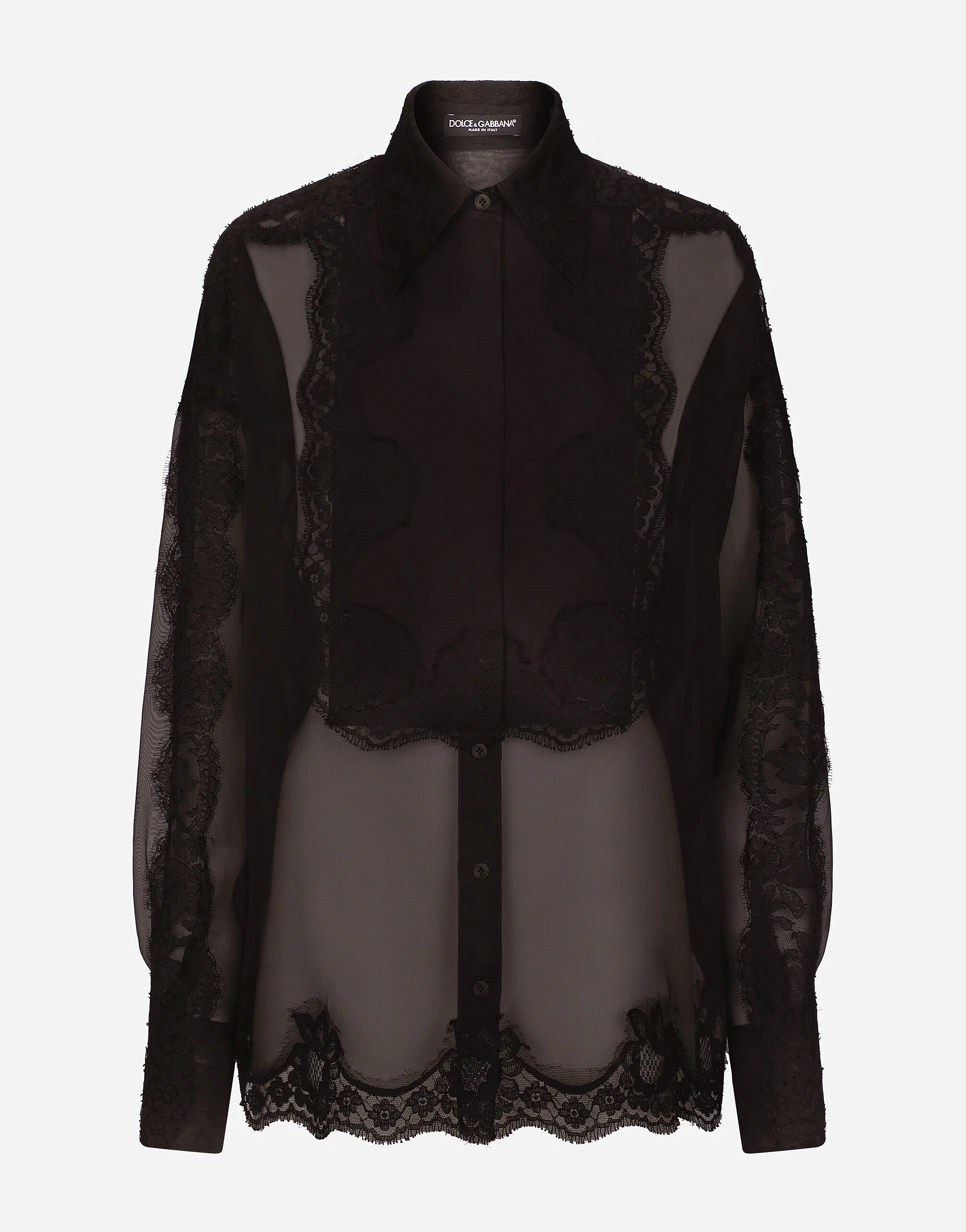 Organza tuxedo shirt with lace inserts: • Shirt collar • Long sleeves • Light cotton shirt front • Regular fit • Button fastenings with branded bottom edge • The piece measures 75 cm from the rear collar seam on a size IT 40 • The model is 175 cm tall and wears a size IT 40 • Made in Italy Care And Details External composition: 50% Silk 32% Cotton 15% Polyamide 3% Viscose