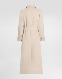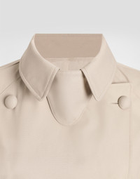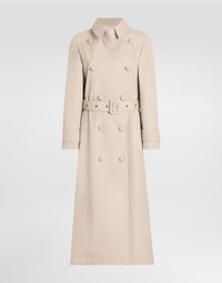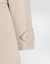 The Spring/Summer 2025 Women’s Collection is celebrating Italian beauty through bold and charismatic femininity. The 50s-inspired lingerie is the star, intermingling with fitted dresses, corsets and oversize trench coats. The iconic jackets have been updated with cropped cuts and modern inserts, while the floral prints add a romantic edge. The eveningwear shines with light fabrics and crystals, accompanied by look-defining accessories, from iconic bags to the cross earrings. Cotton drill trench coat: • Beige • Lapels with rounded tip • Double-breasted • Long raglan sleeves with tab details • Side pockets • Partially lined in silk satin • Button fastenings and belt • The piece measures 130 cm from the center back on a size IT 40 • The model is 175 cm tall and wears a size IT 40 • Made in Italy External composition: 65% Polyester 35% Cotton Internal composition: 100% Silk