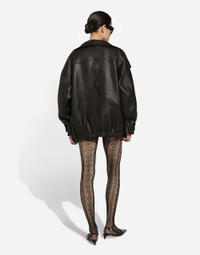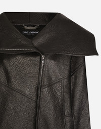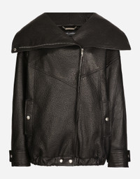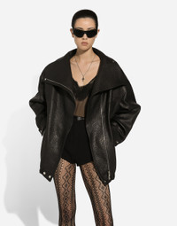 Inspired by 80s fashion photography, the Black Sicily collection masterfully blends masculine and feminine elements, pairing tailored cuts and corset details for the FW 24/25 season. A new vision of the iconic Nero Sicilia black is conveyed through contemporary and sensual looks: jackets and skirts in all-over glen plaid pair with openwork socks, while the 50s-inspired Mun shoes with Eva heel go with the houndstooth Sicily bag featuring crocodile-print leather inserts. Oversize vegetable-tanned lambskin biker jacket: • Black • Wide collar • Long sleeves • Side pockets with press-stud buttons • Inner pockets • Stretch hem • Silk satin lining • Zipper fastening • The piece measures 72 cm from the center back on a size IT 40 • The model is 175 cm tall and wears a size IT 40 • Made in Italy External composition: 100% Sheepskin Internal composition: 100% Silk