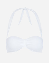 The bandeau bikini top has a retro taste and is made of the precious “sensitive fabric”. The shaped cups guarantee structure and support: • Self-tie bow fastening on the neck • Shaped and padded cups • Logoed back closure in gold-plated nickel-free metal • Matching PVC pocket bag • Made in Italy Care And Details Composition: 80% Nylon 20% Elastane