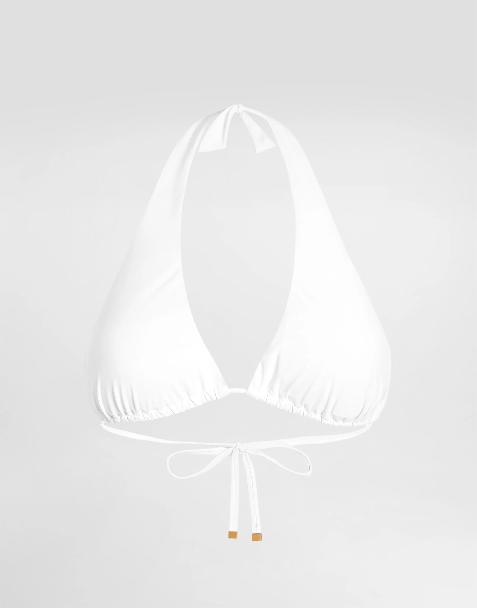 This classic padded triangle bikini top in pure white offers an outstanding fit thanks to the adjustable ties and it comes in fine spandex. • Adjustable ties on the neck and back • Branded DG aglets in nickel-free gold-plated metal • Soft cup with removable padding • Matching PVC pouch • Made in Italy External composition: 75% Polyamide 25% Spandex