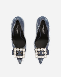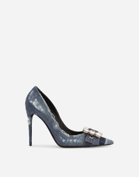 Patchwork denim pumps with rhinestone buckle: • Patchwork denim upper • 105-mm heel • Kidskin insole with branded label • Branded leather sole • Made in Italy The difference in the print placement that you may find on this product is a feature of Dolce&Gabbana’s “Handmade” pieces. A detail that makes every garment or accessory unique and exclusive. Care And Details External composition: 100% Cotton Internal composition: 90% Goatskin 10% Cotton