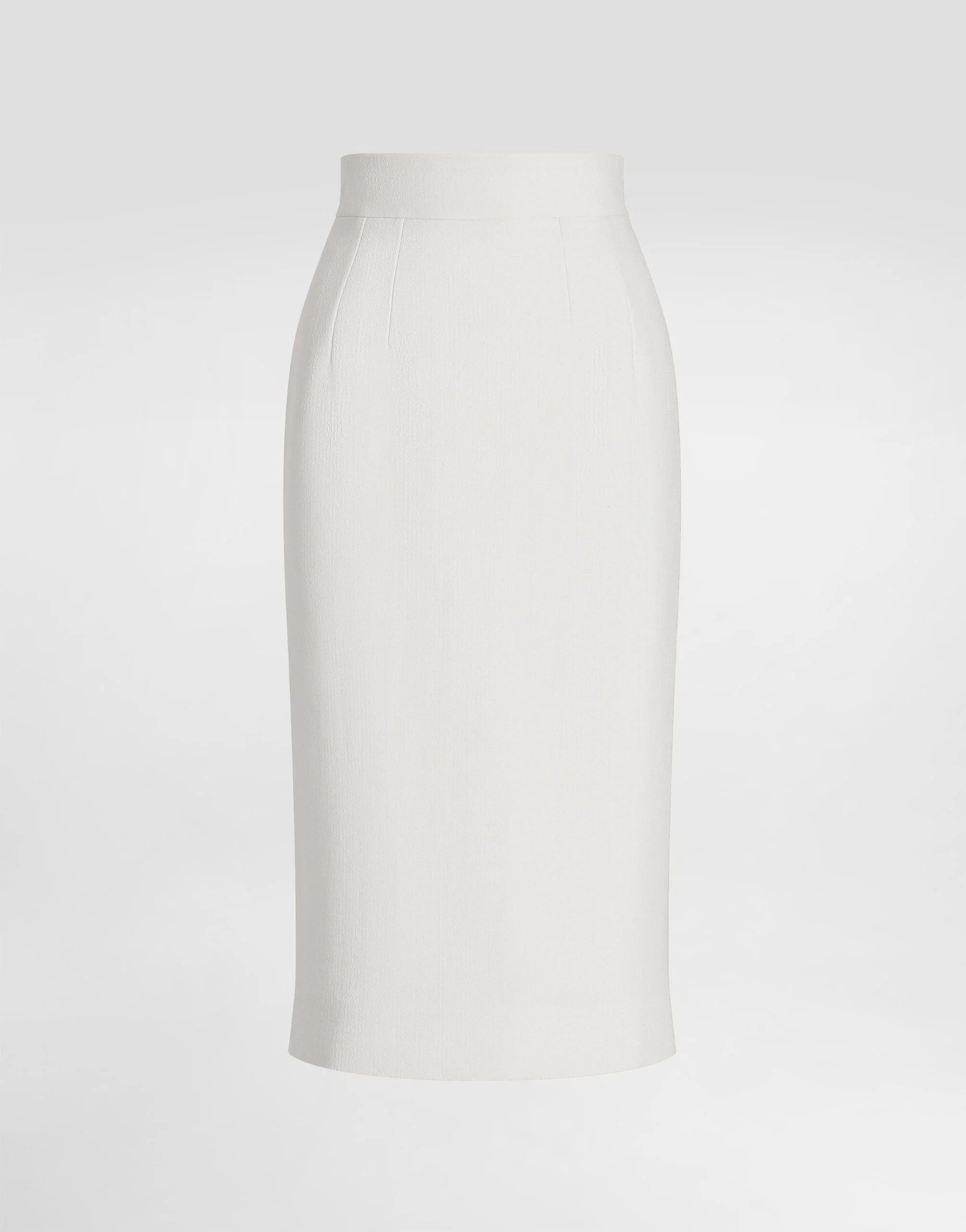 This double crepe skirt is an essential piece for a sleek and sophisticated look. Perfect for formal occasions and special evenings, it stands out for its clean line and refined details. Skirt in double crepe: • White • Slit at the center back • Covered zip closure at the center back • Center back length 70 cm on size 40 IT • Lined • The model is 175 cm tall and wears size 40 IT • Made in Italy External Composition: 100% Virgin Wool Internal Composition: 92% Silk, 8% Elastane
