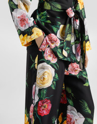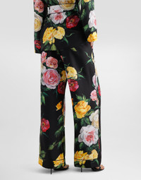 The Women's Black Sicily Collection reinforces Dolce&Gabbana's iconic fabrics and codes rooted in Italian heritage. Sensual silhouettes, highlighted by floral prints and refined corsetry, evoke an intriguing elegance, while the iconic black lace, satin, and velvet dominate the collection. Denim in various shades of blue introduces a contemporary twist, balancing the classic and modern. Embroidered crosses, medals, and jewelry add a sophisticated touch. Silk habotai pajama pants with peony and rose print: • Multi-colored • Stretch Dolce high waist • Front slant pockets • Faux fly on the center front • Inner leg: 77 cm • Hem: 30.4 cm • The model is 175 cm tall and wears a size IT 40 • Made in Italy External composition: 100% Silk