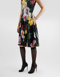 The Women's Black Sicily Collection reinforces Dolce&Gabbana's iconic fabrics and codes rooted in Italian heritage. Sensual silhouettes, highlighted by floral prints and refined corsetry, evoke an intriguing elegance, while the iconic black lace, satin, and velvet dominate the collection. Denim in various shades of blue introduces a contemporary twist, balancing the classic and modern. Embroidered crosses, medals, and jewelry add a sophisticated touch. Peony and rose-print stretch cady calf-length dress with circle skirt: • Multi-colored • V-neckline • Sleeveless • Dart on waist • Side pockets • Partially lined in stretch silk crepe de chine • Zipper fastening at the back • The piece measures 65 cm from the waist down on a size IT 40 • The model is 175 cm tall and wears a size IT 40 • Made in Italy External composition: 97% Viscose 03% Spandex Internal composition: 91% Silk 09% Spandex