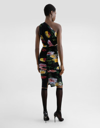 The Women's Black Sicily Collection reinforces Dolce&Gabbana's iconic fabrics and codes rooted in Italian heritage. Sensual silhouettes, highlighted by floral prints and refined corsetry, evoke an intriguing elegance, while the iconic black lace, satin, and velvet dominate the collection. Denim in various shades of blue introduces a contemporary twist, balancing the classic and modern. Embroidered crosses, medals, and jewelry add a sophisticated touch. Stretch tulle one-shoulder calf-length dress with draping and peony and rose print: • Multi-colored • One-shoulder • Sleeveless • Stretch tulle lining • Side zipper and hook fastening • The piece measures 70 cm from the waist down on a size IT 40 • The model is 175 cm tall and wears a size IT 40 • Made in Italy The difference in the print placement that you may find on this product is a feature of Dolce&Gabbana’s “Handmade” pieces. A detail that makes every garment or accessory unique and exclusive. External composition: 90% Polyamide 10% Spandex Internal composition: 80% Polyamide 20% Spandex