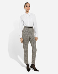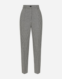 Inspired by 80s fashion photography, the Black Sicily collection masterfully blends masculine and feminine elements, pairing tailored cuts and corset details for the FW 24/25 season. A new vision of the iconic Nero Sicilia black is conveyed through contemporary and sensual looks: jackets and skirts in all-over glen plaid pair with openwork socks, while the 50s-inspired Mun shoes with Eva heel go with the houndstooth Sicily bag featuring crocodile-print leather inserts. Tailored wool houndstooth pants: • Gray • Dolce high waist • Front slant pockets • Welt back pockets • Belt loops • Inner leg: 74 cm • Hem: 17 cm • Zipper and button fastening • The model is 175 cm tall and wears a size IT 40 • Made in Italy External composition: 100% Virgin Wool