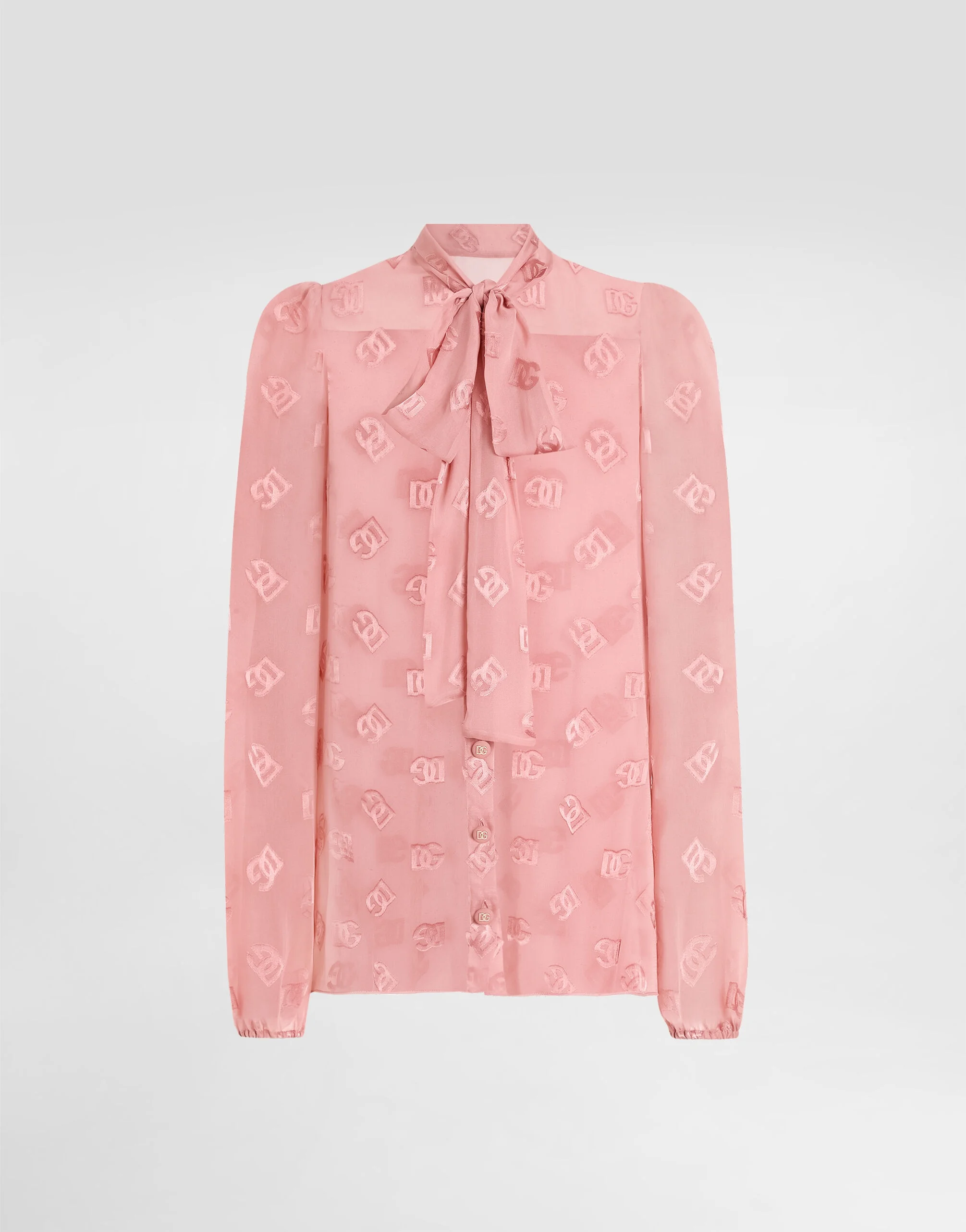 The Women’s DNA Collection is introducing a new side to femininity, which comes in shades of rose quartz, poised between sheerness and opacity, lightness and structure, formality and sensuality. Geometric Dolce Jackets, jacquard pajamas and floral brocade dresses intertwine with ultra-romantic designs. The DG print becomes an iconic statement, while Cordonetto lace and hints of Sicily Black embody the essence of a determined yet romantic femininity. Silk shirt with devore DG logo: • Pink • Shirt collar with pussy-bow • Long sleeves • Regular fit • Button fastenings with branded bottom edge • The piece measures 65 cm from the rear collar seam on a size IT 40 • The model is 175 cm tall and wears a size IT 40 • Made in Italy External composition: 62% Silk 38% Viscose