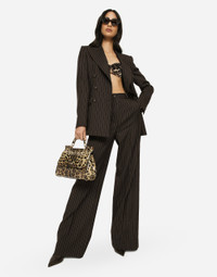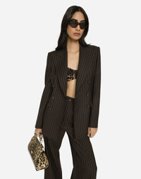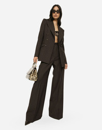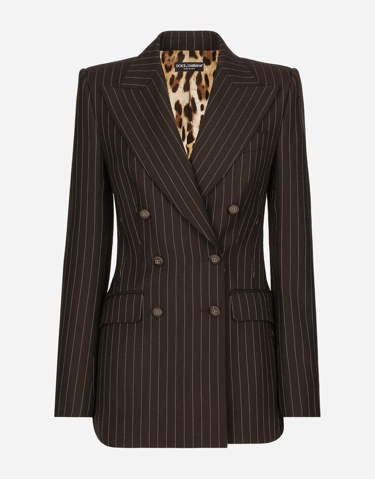 Double-breasted pinstripe wool Turlington jacket: • Brown • Peak lapels • Long sleeves • Flap pockets • Leopard-print stretch satin lining • Covered button fastenings and DG logo • The piece measures 72 cm from the center back on a size IT 40 • The model is 175 cm tall and wears a size IT 40 • Made in Italy Care And Details External composition: 100% Virgin Wool Internal composition: 97% Polyester 3% Spandex