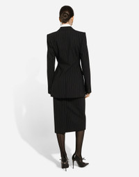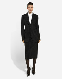 Inspired by 80s fashion photography, the Black Sicily collection masterfully blends masculine and feminine elements, pairing tailored cuts and corset details for the FW 24/25 season. A new vision of the iconic Nero Sicilia black is conveyed through contemporary and sensual looks: jackets and skirts in all-over glen plaid pair with openwork socks, while the 50s-inspired Mun shoes with Eva heel go with the houndstooth Sicily bag featuring crocodile-print leather inserts. Pinstripe stretch wool calf-length skirt: • Black • High-waisted • Stretch silk satin lining • Rear zipper and hook-and-eye fastening • The piece measures 75 cm from the waist down on a size IT 40 • The model is 175 cm tall and wears a size IT 40 • Made in Italy External composition: 96% Virgin Wool 4% Spandex Internal composition: 92% Silk 8% Spandex