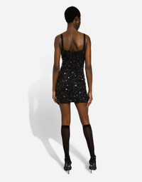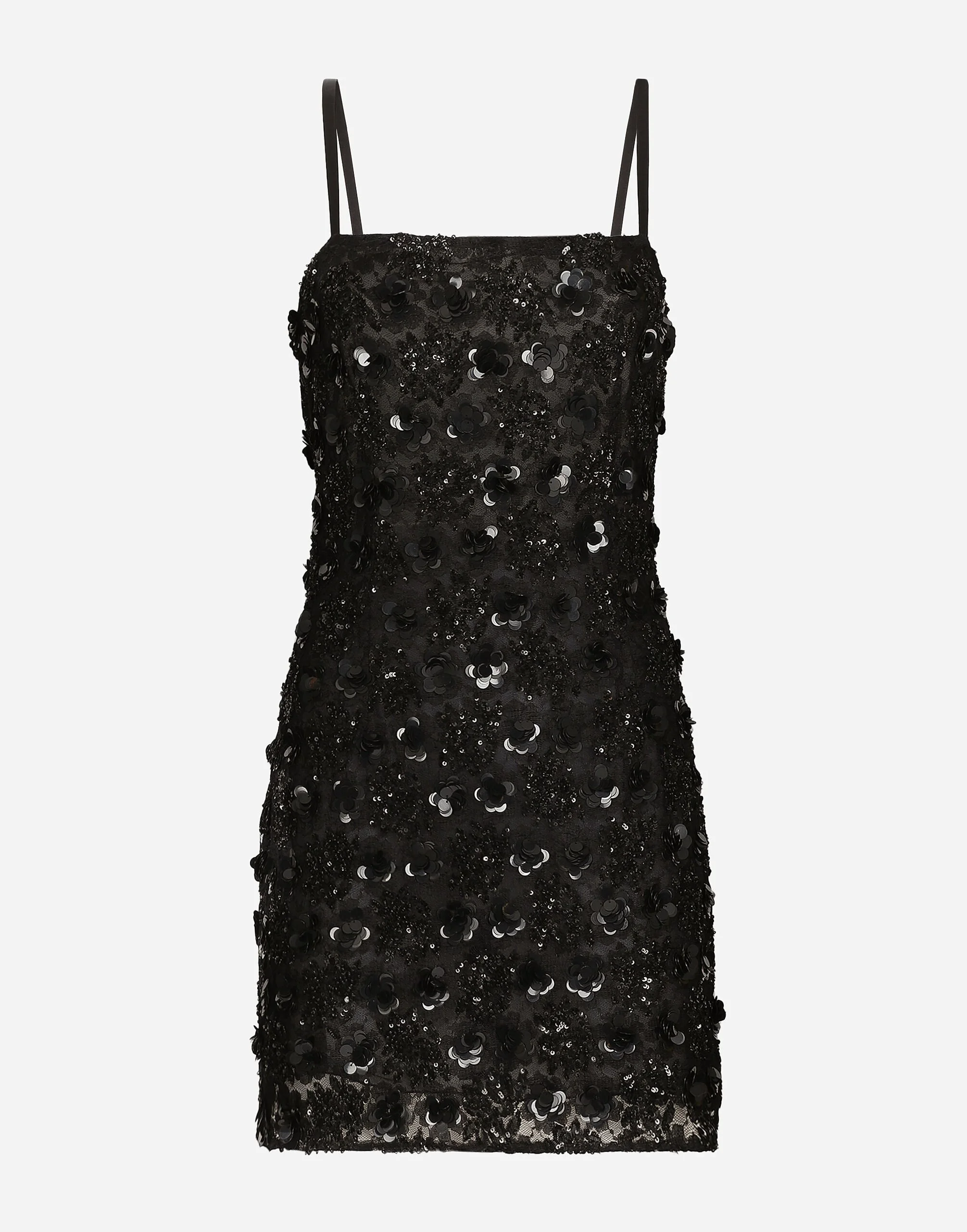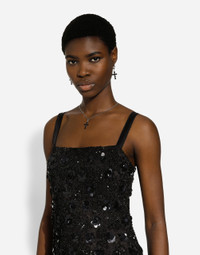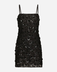 Inspired by 80s fashion photography, the Black Sicily collection masterfully blends masculine and feminine elements, pairing tailored cuts and corset details for the FW 24/25 season. A new vision of the iconic Nero Sicilia black is conveyed through contemporary and sensual looks: jackets and skirts in all-over glen plaid pair with openwork socks, while the 50s-inspired Mun shoes with Eva heel go with the houndstooth Sicily bag featuring crocodile-print leather inserts. Short dress with sequin embellishment: • Black • Straight neckline with satin straps • Tulle lining • Rear zipper and hook-and-eye fastening • The piece measures 62.4 cm from the center back on a size IT 40 • The model is 175 cm tall and wears a size IT 40 • Made in Italy External composition: 63% Viscose 27% Polyamide 10% Silk Internal composition: 92% Polyamide 8% Spandex