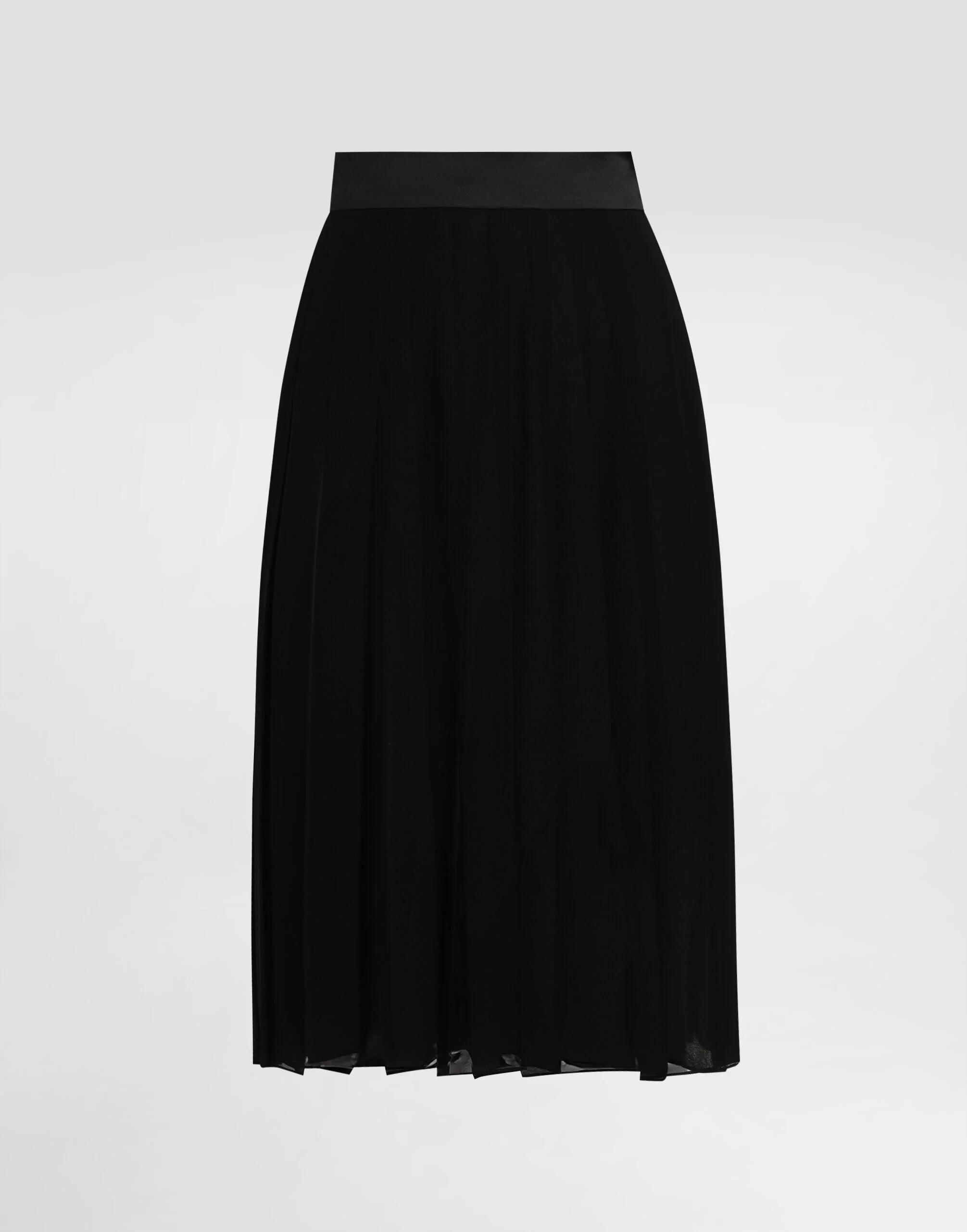 The Women's Black Sicily Collection reinforces Dolce&Gabbana's iconic fabrics and codes rooted in Italian heritage. Sensual silhouettes, highlighted by floral prints and refined corsetry, evoke an intriguing elegance, while the iconic black lace, satin, and velvet dominate the collection. Denim in various shades of blue introduces a contemporary twist, balancing the classic and modern. Embroidered crosses, medals, and jewelry add a sophisticated touch. Pleated chiffon midi circle skirt: • Black • High-waisted • Stretch silk satin underskirt • Rear zipper and hook-and-bar fastening • The piece measures 60 cm from the waist down on a size IT 40 • The model is 175 cm tall and wears a size IT 40 • Made in Italy External composition: 90% Polyester 10% Silk Internal composition: 92% Silk 08% Spandex