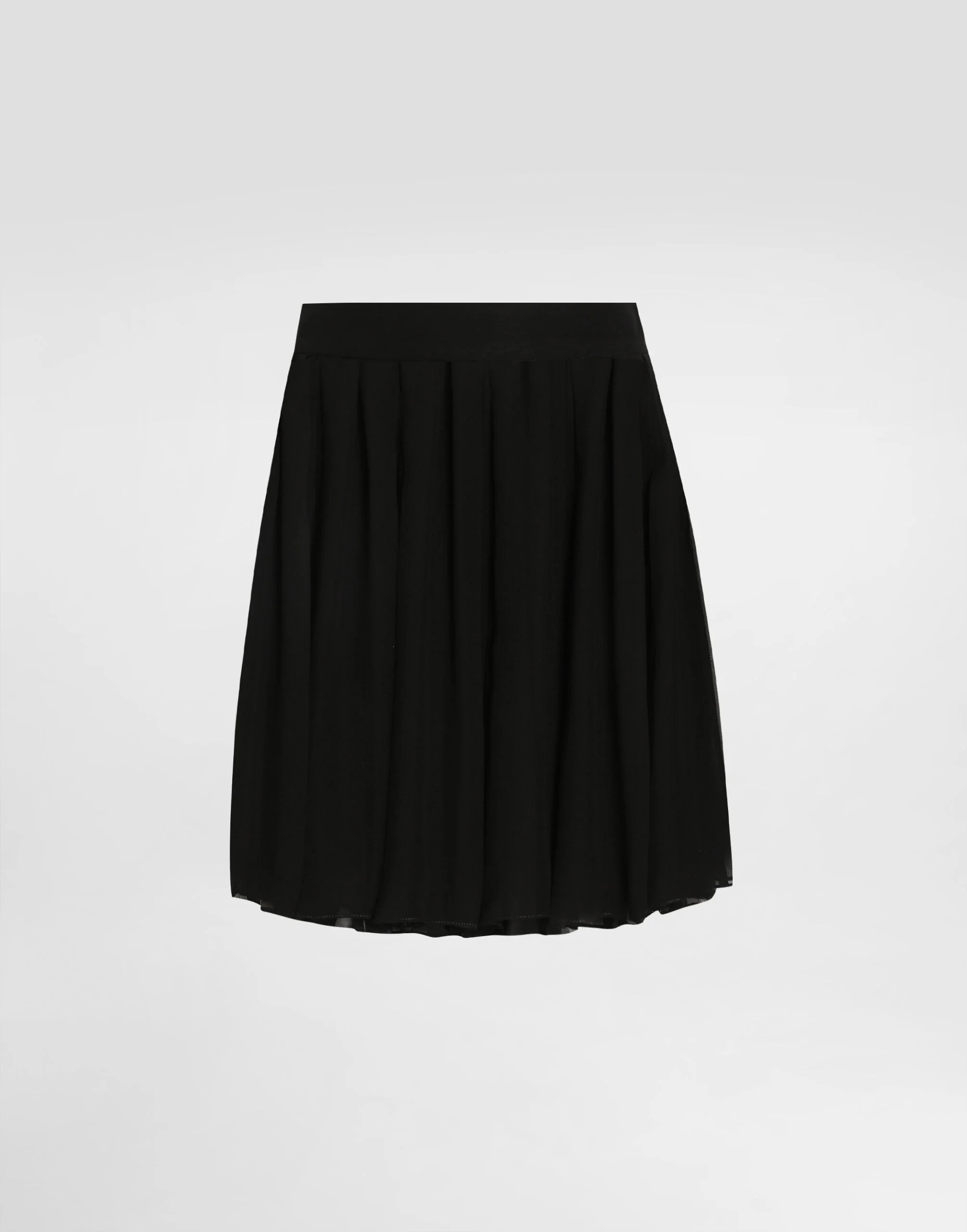 This chiffon skirt is the epitome of lightness and modernity, perfect for those who love a fresh and dynamic look. The pleated design adds a touch of movement and sophistication, making it ideal for any occasion, whether casual or elegant. Pleated chiffon skirt: • Black • Fastening on the center back with invisible zip • Shorter inner skirt • Waist skirt length 42 cm on size 40 IT • The model is 175 cm tall and wears size 40 IT • Made in Italy External Composition: 100% Polyester Internal Composition: 100% Polyester