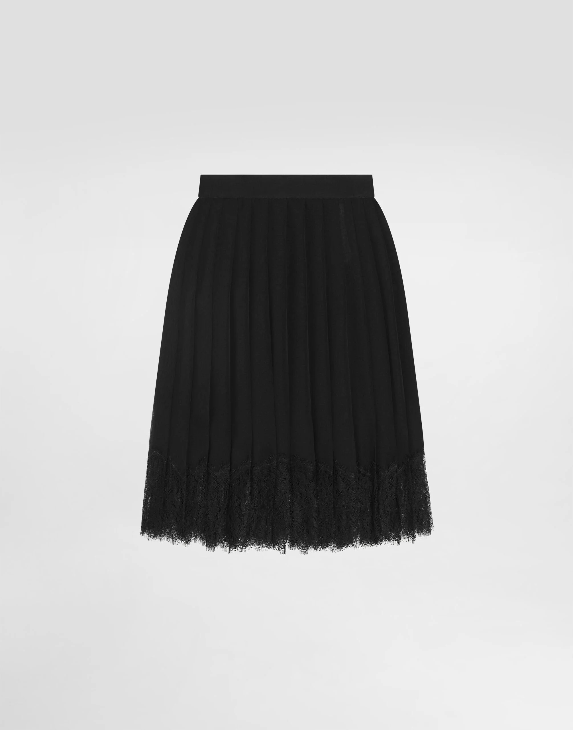 This pleated chiffon short skirt represents modern elegance with a touch of femininity. Perfect for adding a touch of class to your wardrobe, it stands out for its sophisticated design and high-quality details. Short pleated chiffon skirt: • Black • 3 cm high strap • Lace band on hem bottom • Opening at the back with covered zip • With petticoat • The model is 175 cm tall and wears size 40 IT • Made in Italy External Composition: 80% Polyester, 12% Polyamide, 8% Cotton Internal Composition: 91% Silk, 9% Elastane