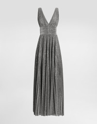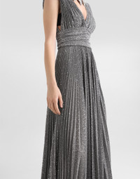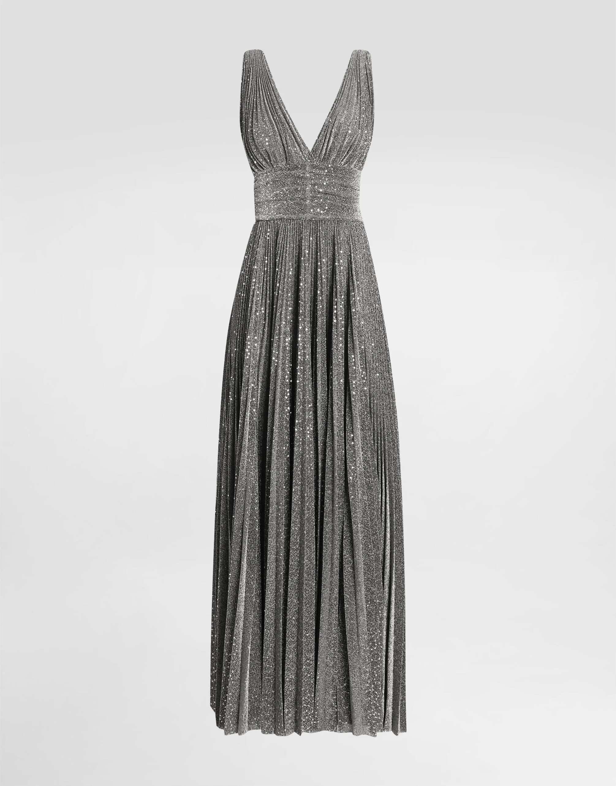 The Everyday Women's Collection reimagines contemporary daily wear with Dolce&Gabbana's signature style codes. Iconic fabrics mix with standout details like embroidered flowers, crystals, and jewel buttons, infusing elegance into every look. Gray animal print accented with green and purple, hyper-geometric jewelry, voluminous shapes and transparencies add unique touches. Men's tweed is reinvented with graphic twists, creating distinctive pieces that reflect refined sensuality. Long pleated dress with micro-sequin embellishment: • Silver • V-neck at the front and back • Sleeveless with wide straps • Lined • Rear zipper and hook-and-bar fastening • The piece measures 110 cm from the waist down on a size IT 40 • The model is 175 cm tall and wears a size IT 40 • Made in Italy External composition: 45% Polyester 37% Metallic Polyester 18% Polyamide Internal composition: 100% Polyamide