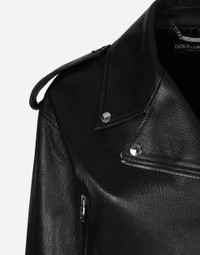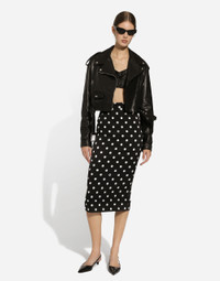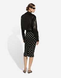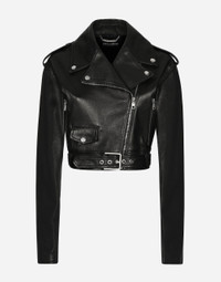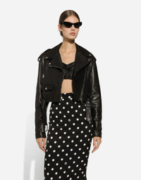 The FW24/25 Mambo Collection is rewriting the rules of Italian elegance, merging the sophisticated style of the 1940s and 1950s with the iconography of American pin-ups. The unmistakable polka-dot motif takes center stage, coming in a variety of shapes and sizes and adorning tulle, charmeuse, twill, silk and poplin, giving life to looks distinguished by black and white accessories and details. An homage to the beauty of Italy and its traditions, the distinctive details of Dolce&Gabbana’s creations. Plongé nappa leather biker jacket: • Black • Long sleeves with zippered cuffs • Epaulets on the shoulders • Stretch satin lining • Zipped front pockets • Zipper fastening on the side • The piece measures 44 cm from the center back on a size IT 40 • The model is 175 cm tall and wears a size IT 40 • Made in Italy External composition: 100% Goatskin Internal composition: 92% Silk 08% Spandex