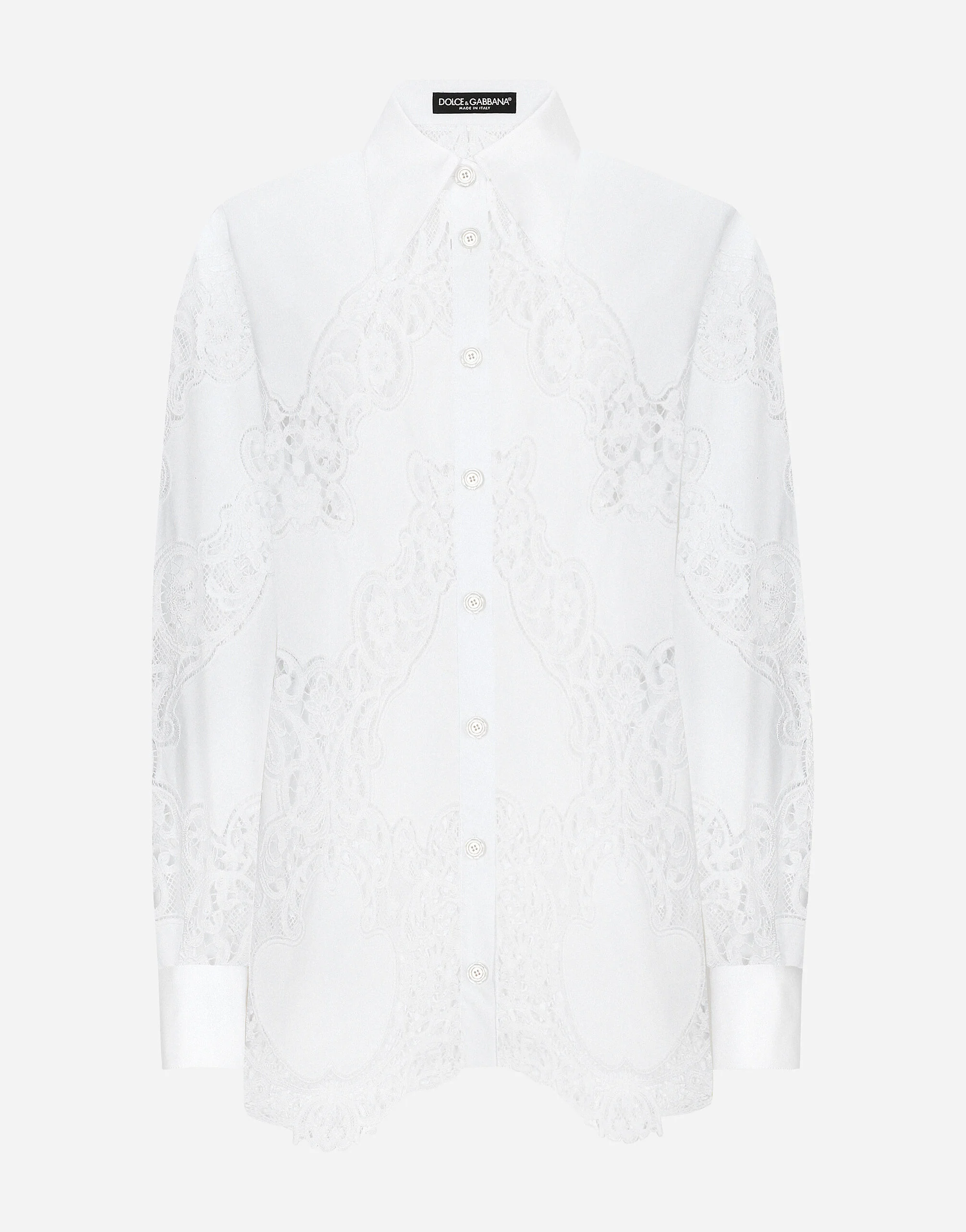 The Italian summers of the 1960s, the candid purity of white, the sophisticated elegance of the jet set of that era. The imagery of the FW24/25 Capri Collection encapsulates all this flawlessly. The pieces range from floaty poplin silhouettes or sack-style dresses and skirts, to brocade outerwear and floral-inlay fabric shirts. The iconic bags – the Logo Bag, the Sicily Bag and the Dolce Box – complement the looks, while the shoes come embroidered with designs inspired by the crystal-clear sea of Capri. Cotton poplin shirt with floral openwork embroidery: • White • Shirt collar • Long sleeves • Regular fit • Button fastenings • The piece measures 68 cm from the center back on a size IT 40 • The model is 175 cm tall and wears a size IT 40 • Made in Italy External composition: 92% Cotton 08% Polyester
