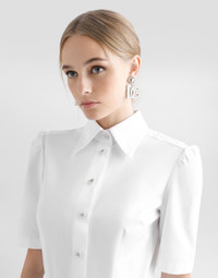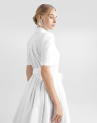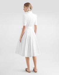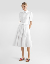 The Spring/Summer 2025 Warm Weather Collection is a vibrant ode to the beauty of the floral world, celebrating the elegance and vitality that lie at the heart of the brand’s DNA. Delicate, colorful bouquets dance across light dresses, skirts, trousers, and beachwear, infusing each piece with a sense of romance and freshness. Coordinated accessories, from scarves to headbands, add charm. An explosion of color and blooms, this collection captures the brand’s unmistakable spirit. Cotton poplin calf-length shirt dress: • White • Shirt collar • Short sleeves • Belted waist • Unlined • DG branded buttons on the front • The piece measures 110 cm from the center back on a size IT 40 • The model is 175 cm tall and wears a size IT 40 • Made in Italy External composition: 100% Cotton