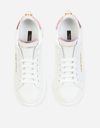 The Portofino sneakers are made entirely of nappa calfskin with DOLCE & GABBANA lettering in light gold-plated metal and have become an iconic model of the brand. New colors in line with the themes of the season are offered in the SS20 collection: • Calfskin upper with contrasting laminated dauphine calfskin heel and logoed pearl • Logoed label • Flat laces • Calfskin footbed with logoed label • Logoed rubber sole • Packaging in theme with the product • Made in Italy Care And Details External Composition: 100% Calfskin Internal Composition: 51% Lambskin 5% Goatskin 11% Natural Rubber 33% Polyester
