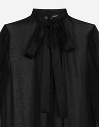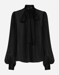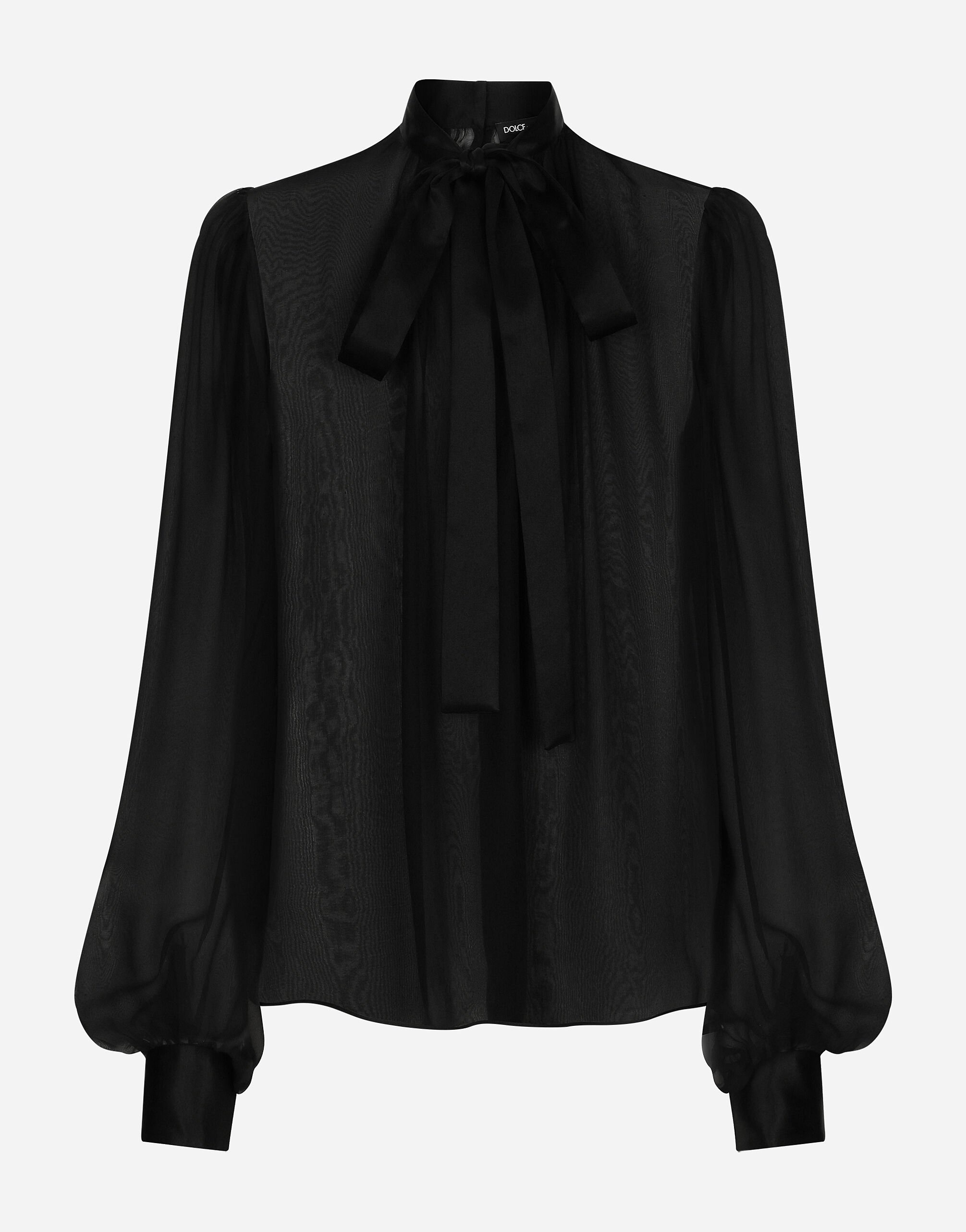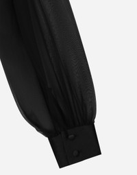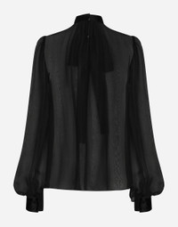 Menswear and womenswear mix and mingle, influencing one another and creating tailoring that embraces endless nuances, from the boldest to the most sophisticated, to define the rules of eternally classy femininity. A monochrome retelling in Nero Sicilia black, embellished by golden touches and rhinestones, adorning clean lines and incorporating stylish fabrics such as velvet, chiffon, lace, organza, and unique mesh details, the expression of authentic beauty for dresses, shirts and accessories. Silk chiffon pussy-bow blouse: • Black • Round neck with pussy-bow • Long sleeves • Shirt-style cuffs • Regular fit • Unlined • Small press-stud fastening on the back of the neck • The piece measures 62 cm from the center back on a size IT 40 • The model is 175 cm tall and wears a size IT 40 • Made in Italy External composition: 100% Silk