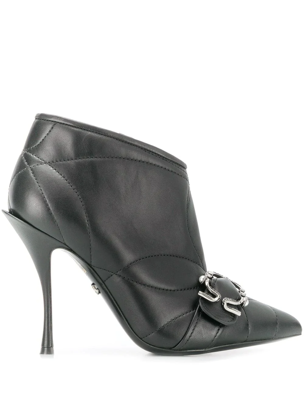 quilted buckled leather booties Dolce & Gabbana exude Sicilian elegance, taking inspiration from everyday Italian lifestyle, like these black quilted buckled leather booties. Featuring a pointed toe, a side zip fastening, a branded insole and a high stiletto heel. Made in Italy Composition Outer: Calf Leather 100% Lining: Calf Leather 100% Sole: Calf Leather 100%