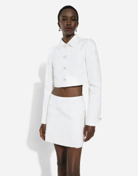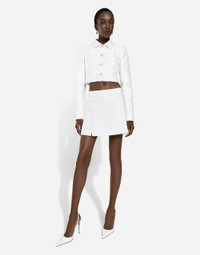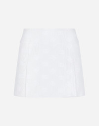 The DNA collection is distinguished by timeless shapes, bringing together three concepts: Sicilian flair, tailoring and sensuality. Nero Sicilia black and optical white predominate and pair with colors that catapult us onto the island of Sicily and make us dream. The designers channel the timeless wardrobe made up of creations that are instantly unmistakable in their simplicity, presenting us with sophisticated beauty loaded with meaning and symbolism that transcends fashion. Quilted jacquard miniskirt with all-over DG logo: • White • Regular rise • Side slit • Stretch silk crepe de chine lining • Rear zipper and hook-and-eye fastening • The piece measures 40 cm from the waist down on a size IT 40 • The model is 175 cm tall and wears a size IT 40 • Made in Italy External composition: 43% Cotton 34% Polyester 23% Silk Internal composition: 92% Silk 8% Spandex