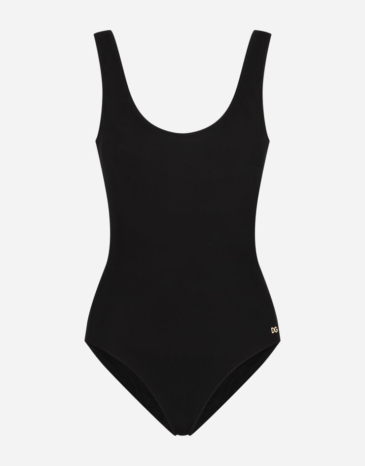 This racing-style one-piece swimsuit has a contemporary sporty feel. It will be perfect for your days on the beach and for a dip in the pool: • Deep neckline • DG logo in nickel-free gold-plated metal on the front side • Matching PVC pouch • Made in Italy Care And Details External composition: 75% Polyamide 25% Spandex
