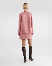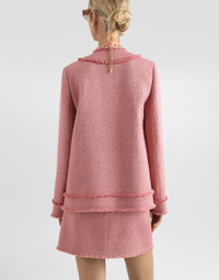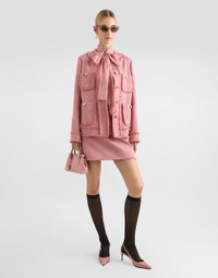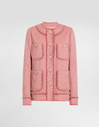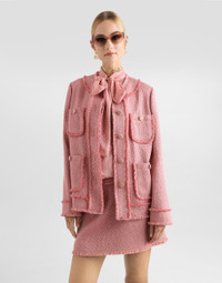The Women’s DNA Collection is introducing a new side to femininity, which comes in shades of rose quartz, poised between sheerness and opacity, lightness and structure, formality and sensuality. Geometric Dolce Jackets, jacquard pajamas and floral brocade dresses intertwine with ultra-romantic designs. The DG print becomes an iconic statement, while Cordonetto lace and hints of Sicily Black embody the essence of a determined yet romantic femininity. Single-breasted wool raschel tweed jacket: • Pink • Round neckline • Long sleeves • Patch pockets with inner press-stud button and covered decorative button with the DG logo on the exterior • Silk satin lining • Inner press-stud fastenings and decorative cannete-covered buttons with DG logo on the exterior • The piece measures 65 cm from the rear collar seam on a size IT 40 • The model is 175 cm tall and wears a size IT 40 • Made in Italy External composition: 67% Virgin Wool 27% Viscose 06% Polyamide Internal composition: 100% Silk
