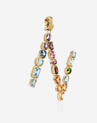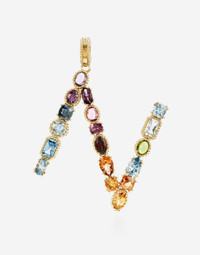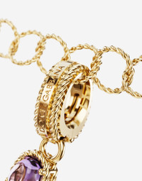 Attention to detail, chromatic harmonies, craftsmanship and a pinch of playful lightness narrate a new chapter of Dolce&Gabbana Fine Jewellery. the Alphabet Collection is the new line inspired by the fascinating power of letters which, from initials of a name, can be transformed into words and messages, with endles combinations. The yellow gold charm is illuminated by a veritable rainbow of natural gemstones such as topaz, garnet, amethyst, citrine, peridot and tourmaline. the shades of their colours, dominated by blue, green, purple, red, pink and yellow, evoke the warm atmospheres of Sicily. The multiple shapes of the crystals are also emphasized by the bezels, which alternate twisted thread processing and smooth surfaces. Technical specifications. • Gold yellow 18 Kt. • Gemstones. n.1 oval deep purple amethyst, n.1 oval purple amethyst cabochon, n.1 oval light purple amethyst, n.1 oval cabochon pink tourmaline, n.1 oval violet red rhodolite garnet, n.1 oval orange-red exonite garnet, n.1 drop-shaped “Madeira" quartz, n.1 round intense yellow citrine, n.1 oval yellow citrine, n.1 cushion light yellow citrine, n.1 drop shaped blue / green tourmaline, n.1 oval green cabochon peridot, n.1 rectangular with removed sharp corners green quartz, n.2 oval and round “Sky" blue topazes, n.2 rectangular with truncated corners and round topazes "Swiss" blue, n.1 cushion “London" blue topaz. • Made in Italy. Complete your look with the twisted wire yellow gold chain and compose your own favourite word. Suggested distance between letters is 5 rings. Yellow 18 kt Gold