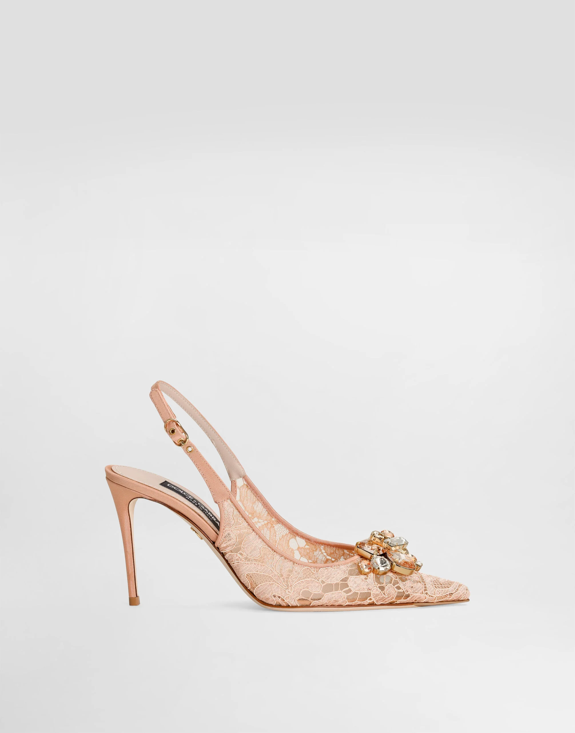 Featuring an iconic, timeless shape, these slingbacks from the Rainbow collection come in lurex lace. Feminine and elegant, they flaunt the iconic brooch made from colorful crystals that match the upper. Rainbow lace slingbacks in lurex lace with brooch: • Pink • Mesh upper covered in lurex lace • 90-mm heel • Item comes in themed packaging • Made in Italy