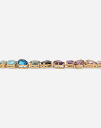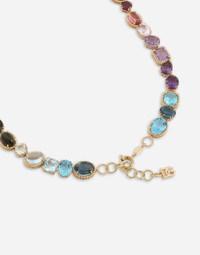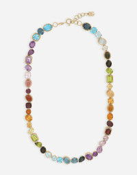 Necklace composed of a chain with twisted wire rings and 46 different gemstones with different cuts and settings, connected in such a way as to create a carefully crafted curve. The DG crossed logo has been added as the end of the adjustable twisted wire chain. Technical specifications: 18 Kt Yellow Gold Lenght: 52+12 cm Gemstones: 1 amethyst (quartz variety) square shape; 2 amethysts (quartz variety) pear shape; 4 amethysts (quartz variety) oval shape; 2 amethysts (quartz variety) round shape; 1 step amethyst (quartz variety); 1 heliodore (beryl variety) round shape; 1 cabochon citrine (quartz variety); 1 citrine (quartz variety) square shape; 1 citrine (quartz variety) oval shape; 1 citrine (quartz variety) pear shape; 1 cabochon “Madera” citrine (quartz variety); 1 “Madera” citrine (quartz variety) round shape; 2“Madera” citrines (quartz variety) oval shape; 1“Madera” citrine (quartz variety) round shape; 1 cabochon garnet; 1 garnet: rectangular shape; 1 garnet: square shape; 1 rhodolite garnet: round shape; 1 rhodolite garnet: oval shape; 1 kunzite (spodumene variety) oval shape; 1 peridot: oval shape; 1 peridot: pear shape; 2 peridots: rectangular shape; 1 “London” topaz: pear shape; 1 cabochon “London” topaz; 3 “London” topaz: oval shape; 1 cabochon “Sky” topaz; 3 “Swiss” topazes: oval shape; 3 “Swiss” topazes: square shape; 1 cabochon tourmaline; 2 tourmalines: oval shape; 1 cabochon tourmaline. Made in Italy 18kt yellow gold