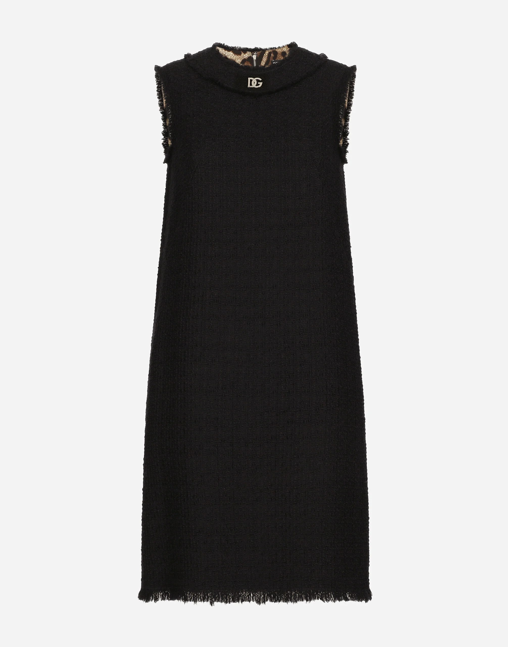 Raschel tweed calf-length dress with DG logo: • Round neck • Sleeveless • Leopard-print stretch satin lining • Rear zipper and hook-and-eye fastening • The piece measures 95.3 cm from the rear seam on a size IT 40 • The model is 175 cm tall and wears a size IT 40 • Made in Italy Care And Details External composition: 93% Wool 7% Spandex Internal composition: 97% Polyester 3% Spandex
