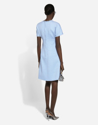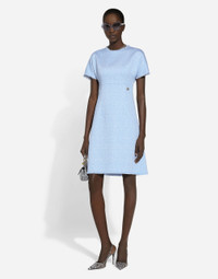 In the FW 24/25 DNA Collection, the rules of classic tailoring have been reworked with an innovative feel. New raschel weave techniques feature on micro-jackets and coats, and original textures are woven on trench coats, skirts, jacquard suits and shirts. The color palette made up of Nero Sicilia black, Milky White and Ocean Blue is also original. The iconic bags in fine nappa leather and “Pyton FC Machine” finish off the looks. Wool raschel tweed midi dress with DG logo: • Light blue • Round neck • Short cap sleeves • Tonal stretch silk satin lining • Rear zipper and hook-and-eye fastening • The piece measures 55 cm from the waist down on a size IT 40 • The model is 175 cm tall and wears a size IT 40 • Made in Italy External composition: 67% Virgin Wool 27% Viscose 06% Polyamide Internal composition: 92% Silk 08% Spandex