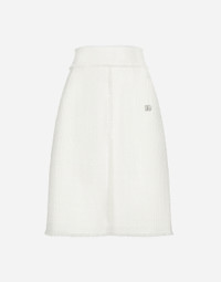 The DNA collection is distinguished by timeless shapes, bringing together three concepts: Sicilian flair, tailoring and sensuality. Nero Sicilia black and optical white predominate and pair with colors that catapult us onto the island of Sicily and make us dream. The designers channel the timeless wardrobe made up of creations that are instantly unmistakable in their simplicity, presenting us with sophisticated beauty loaded with meaning and symbolism that transcends fashion. Raschel tweed midi skirt with central slit: • White • High-waisted • A-line • Metal DG logo • Central vent • Tonal stretch silk satin lining • Rear zipper and hook-and-eye fastening • The piece measures 62 cm from the waist down on a size IT 40 • The model is 175 cm tall and wears a size IT 40 • Made in Italy External composition: 93% Wool 7% Polyamide Internal composition: 92% Silk 8% Spandex