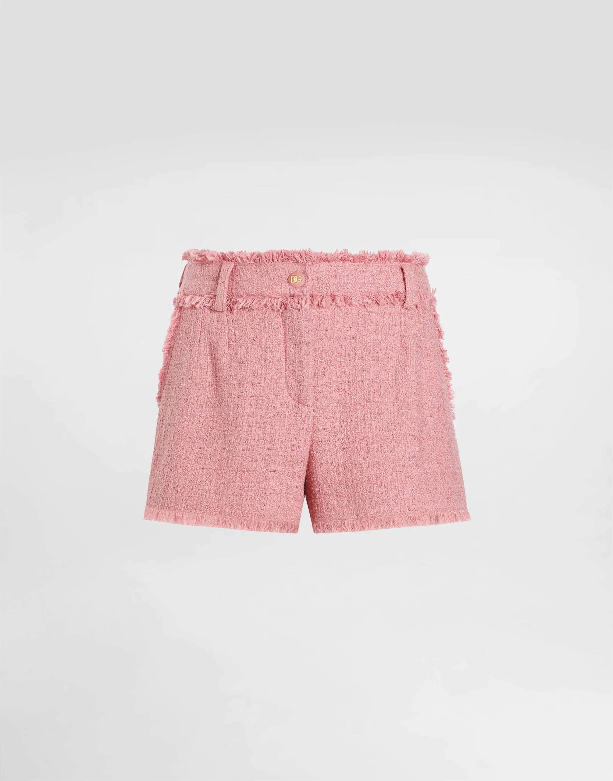The Women’s DNA Collection is introducing a new side to femininity, which comes in shades of rose quartz, poised between sheerness and opacity, lightness and structure, formality and sensuality. Geometric Dolce Jackets, jacquard pajamas and floral brocade dresses intertwine with ultra-romantic designs. The DG print becomes an iconic statement, while Cordonetto lace and hints of Sicily Black embody the essence of a determined yet romantic femininity. Cotton raschel tweed shorts: • Pink • Regular rise • Slant pockets • Belt loops • Inner leg: 6 cm • Hem: 34 cm • Zipper and cannete-covered button with DG logo • The model is 175 cm tall and wears a size IT 40 • Made in Italy External composition: 90% Cotton 10% Viscose